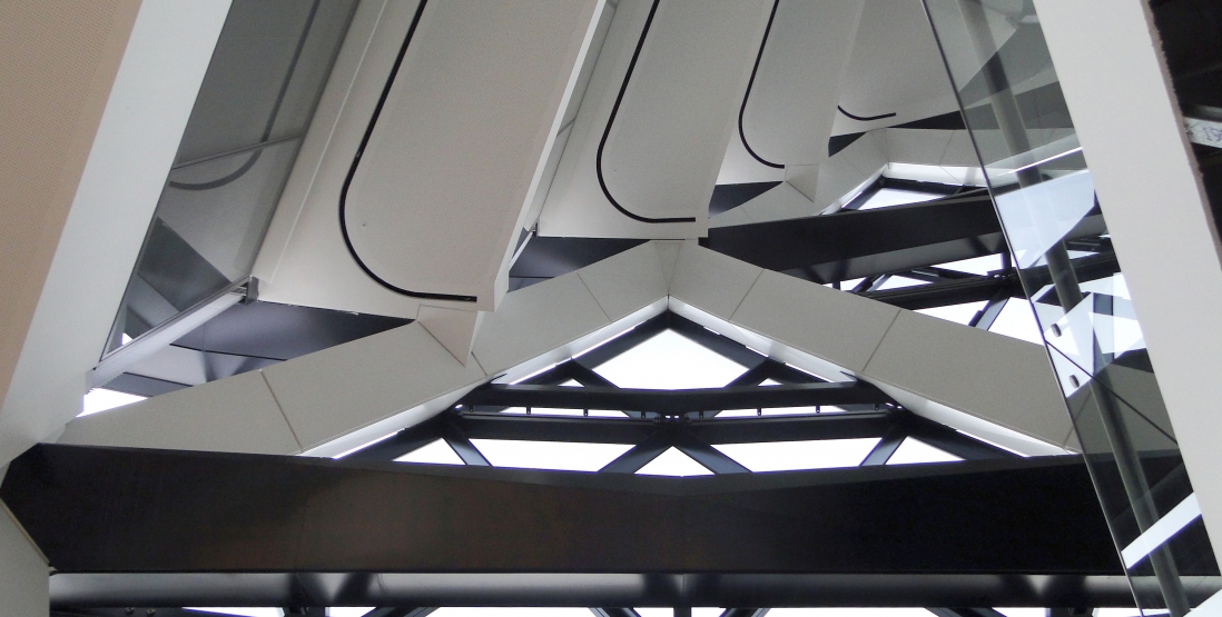 In twenty-four of the thirty-six bays on any given level, where the office fingers meet the perimeter, a single-glazed curtain-wall with mechanically operated blinds sits just inside the diagrid, encasing the structure in the airspace of a double-skin Abluft or exhaust façade system.