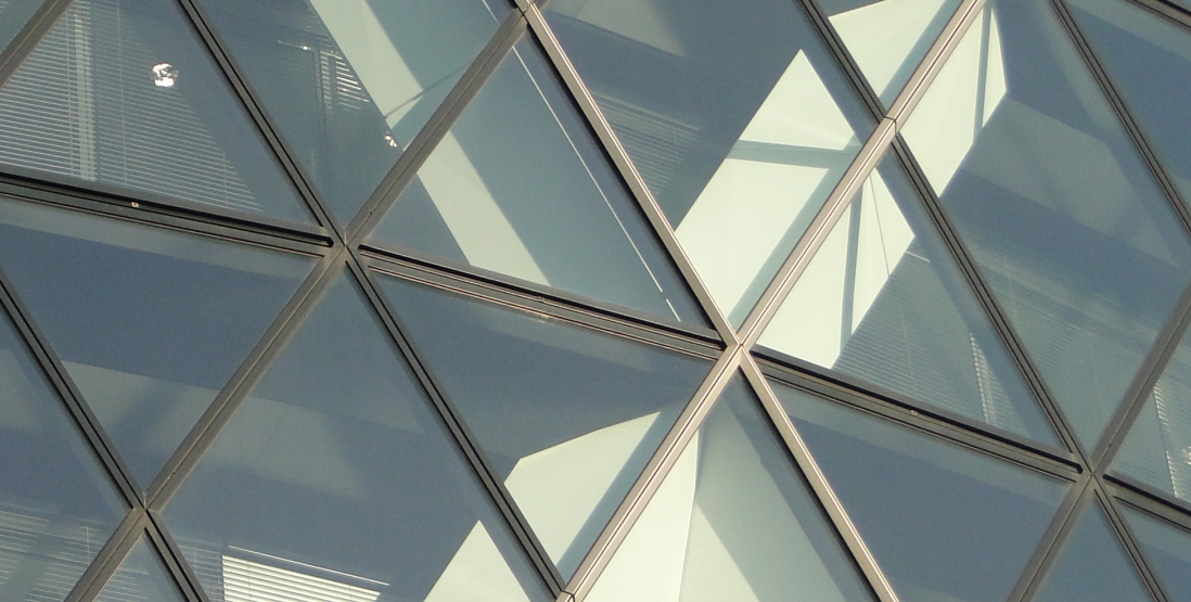 For most of its extent, the diagrid is encased by a clear double-glazed curtain wall based on a diamond-shaped module four meters tall by five degrees of the circumference wide. Where these diamonds are bisected by a floorplate they are divided into a pair of triangular windows separated by a transom containing a narrow air vent.