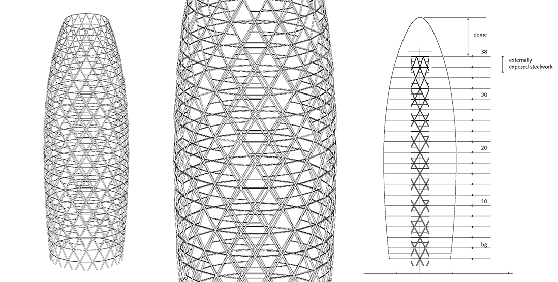 From the ground to the equator at Level 17 each floor has a slightly greater diameter than the one below. From 18 up the diameters dwindle as the building tapers to its rounded apex. Up to the 38th floor, the tower is supported by a cylindrical steel core and a perimeter steel diagrid generated by intersecting lines of raked columns that follow and mirror the spiraling of the atria around the building. Stiffened every two stories at its nodes by horizontal hoops that tie back to the core at ten-degree intervals, the diagrid forms a triangulated cage that resists lateral wind loading and so allows for a lighter, more open core that affords planning flexibility. Because the building is circular in plan and curves in section as well, the local connection geometry between the diagrid’s straight structural members and its structural nodes changes from floor to floor. Powdercoated aluminum panels encase the diagrid to mask and fireproof the steel. Levels 39 and 40 are supported by the structure below and enclosed not by the diagrid but by a lighter steel dome that sits atop it.