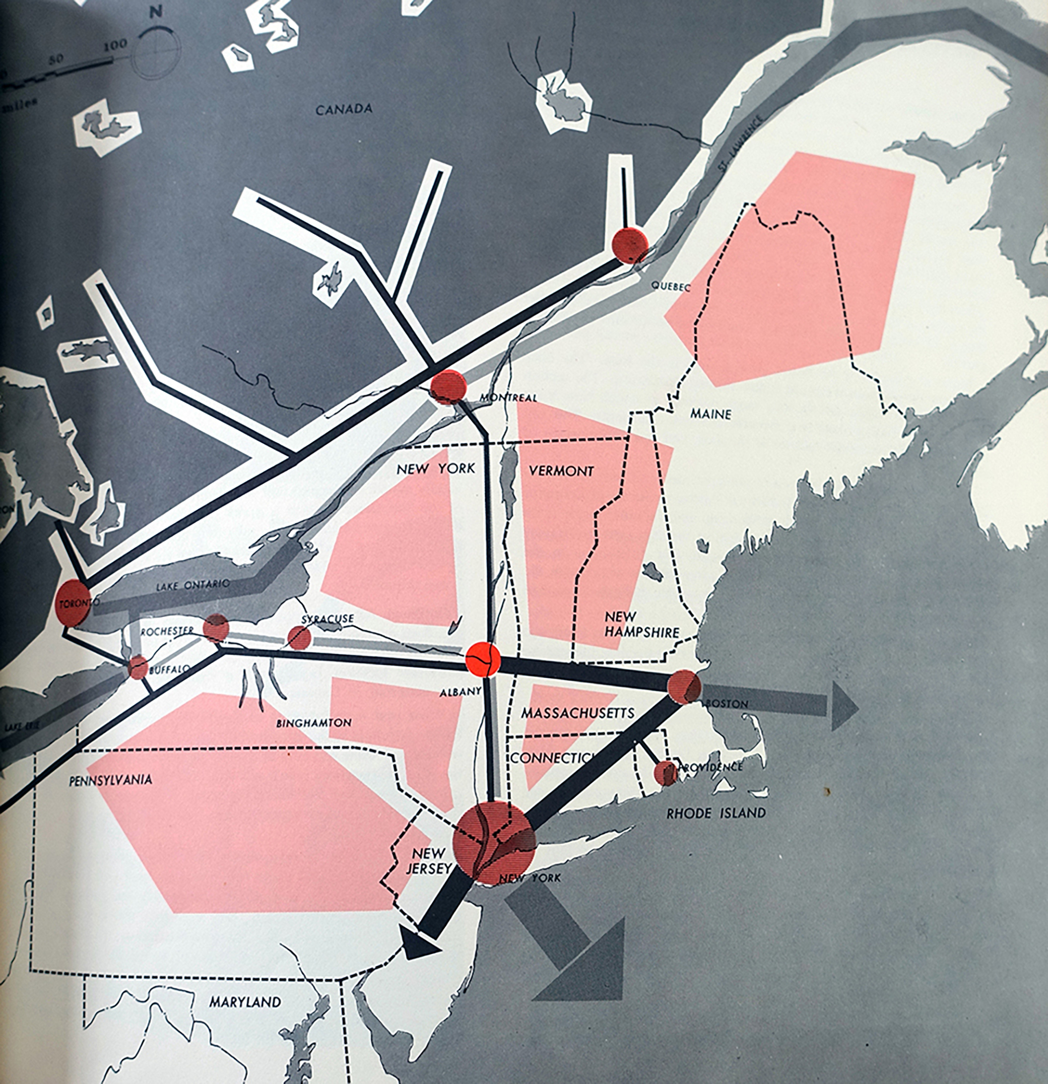 Rationalizing and visualizing Albany as a crossroads of an indeterminate region did important work. The crossroads designation created an illusion of centrality for Albany at the hinge between, rather than the periphery of, the Great Lakes and Atlantic territories. Centering provincial Albany in a transnational “super-region” to echo the city’s relevance during the Erie Canal’s heyday, with a nod to its highway-driven future, flattered political leaders’ ambitions for the capital and for the State of New York as “the greatest and most powerful State in the Union,” the report boasted.16