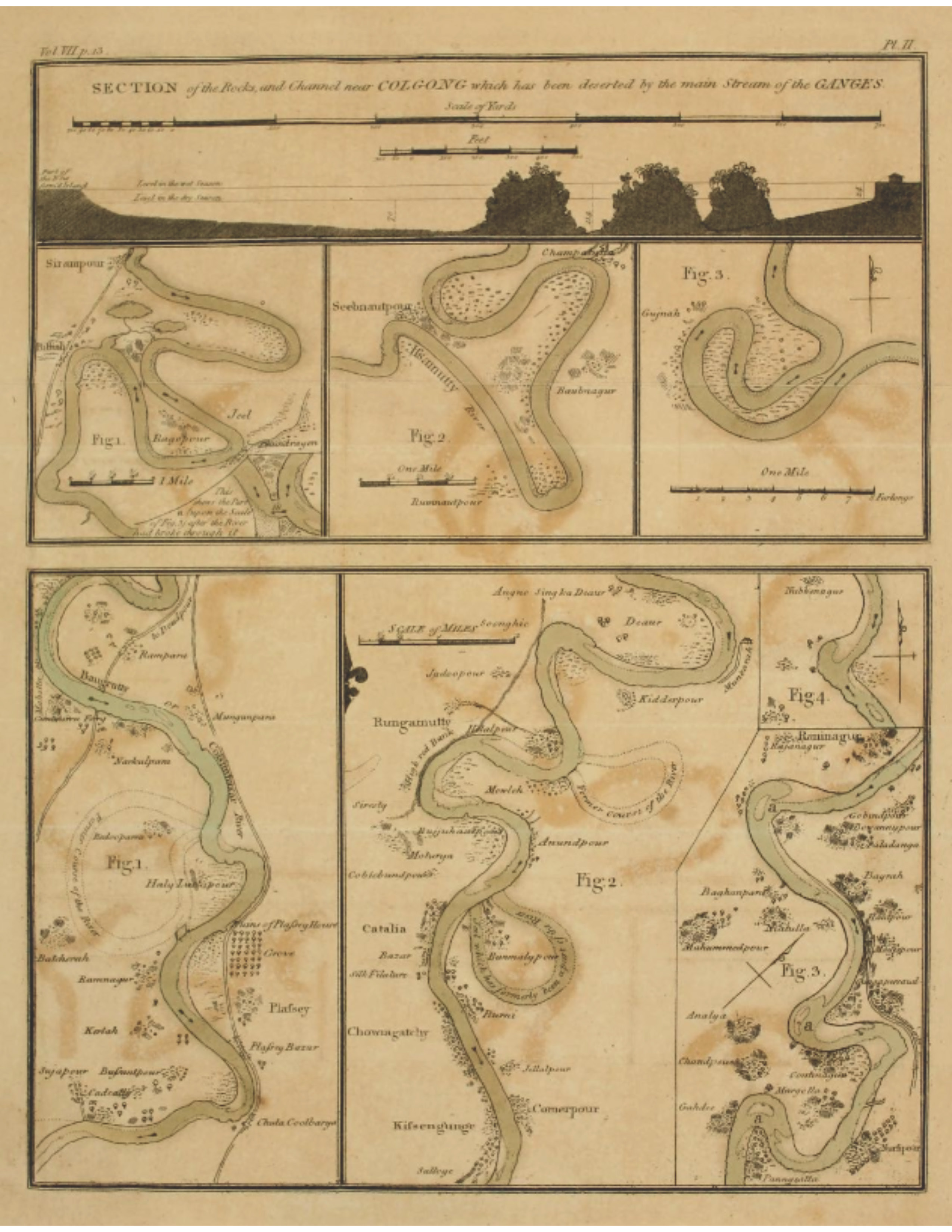 A decade and half ago, while perusing the eighteenth- and early nineteenth-century maps of the Gangetic plains executed by British surveyors, I was struck by the cartographic approach to the hydro-geographical particularities of the region. Foremost among these British-made maps were those of the Ganges and Brahmaputra Rivers produced by James Rennell between 1764 and 1771. Primarily used in military reconnaissance, and secondarily for gauging revenue potential, the maps in essence were tools for consolidating territory. With the declining power of the Mughal empire, the political boundaries in eastern and northern India had become unsettled. The English East India Company, under whose aegis the map-making was undertaken had asserted territorial supremacy over the Mughal province of Bengal in 1757. The northern and western frontiers of the vast province remained unconsolidated from a military point of view. The map makers were thus instructed to record navigable routes, sites of shelter, water sources, the produce of the country, and the general lay of the land. Much more than empire was unsettled, however.