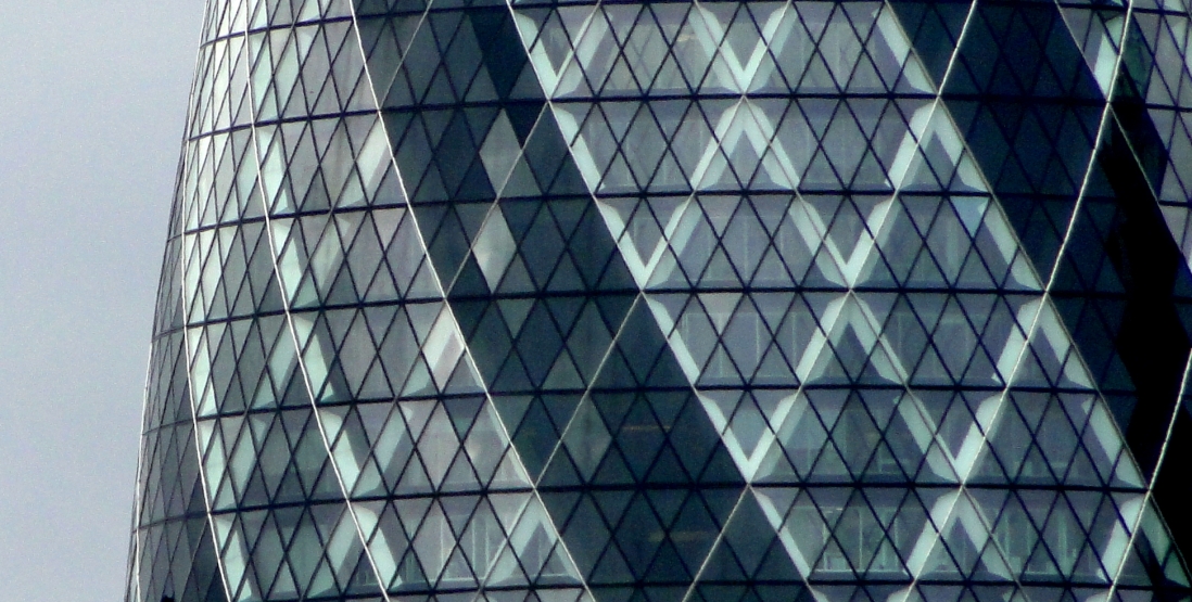 For most of its extent, the diagrid is encased by a clear double-glazed curtain wall based on a diamond-shaped module four meters tall by five degrees of the circumference wide. Where these diamonds are bisected by a floorplate they are divided into a pair of triangular windows separated by a transom containing a narrow air vent.