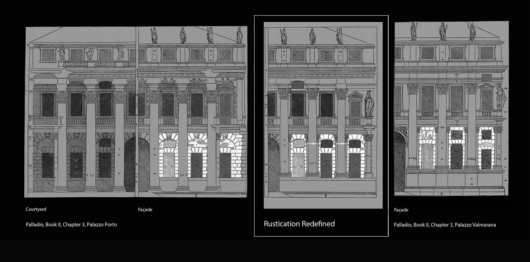 (c) Andrea Palladio, Palazzo Porto Courtyard Elevation and Façade Elevation Overlaid, “rustication.” Digital highlighting by the author.