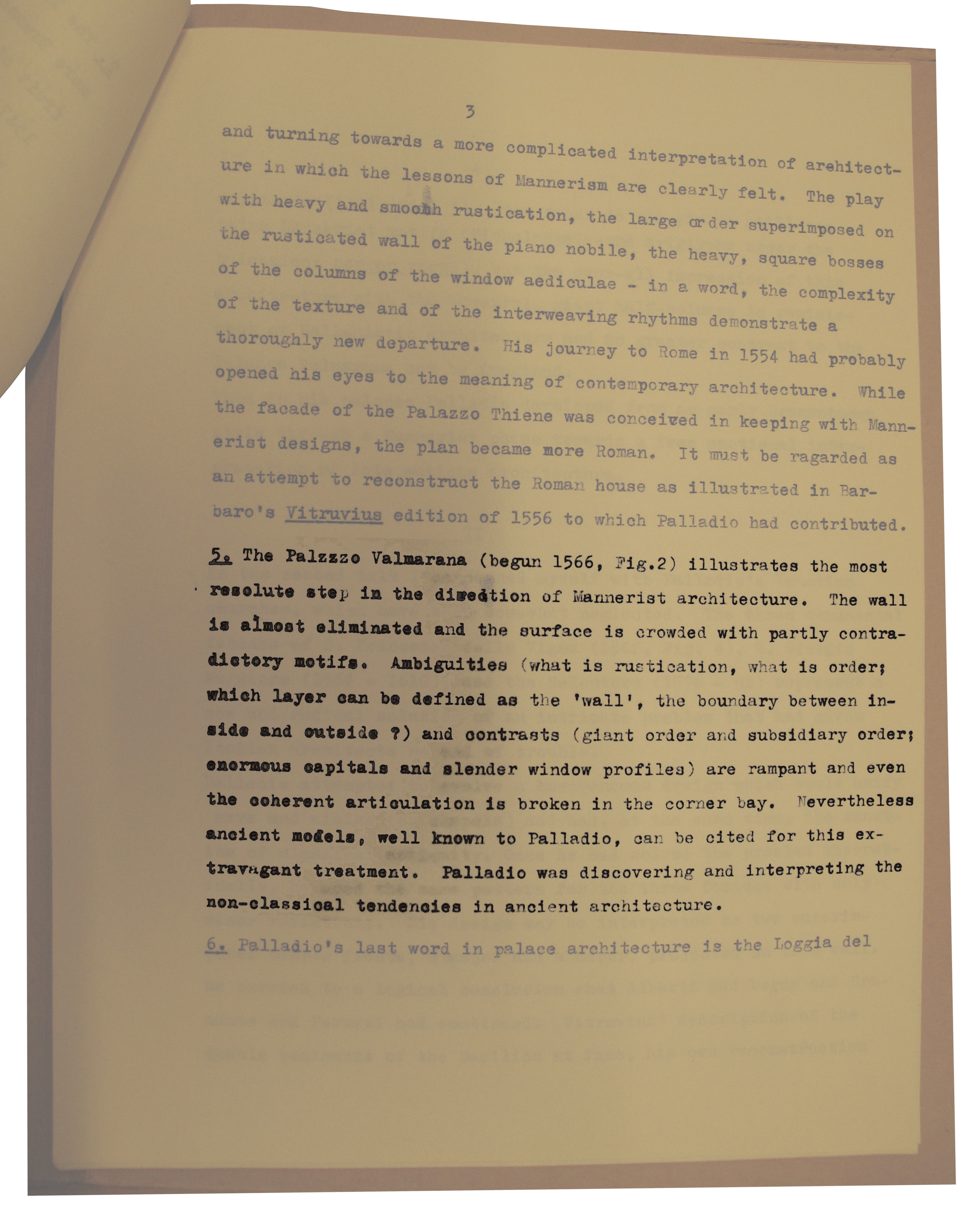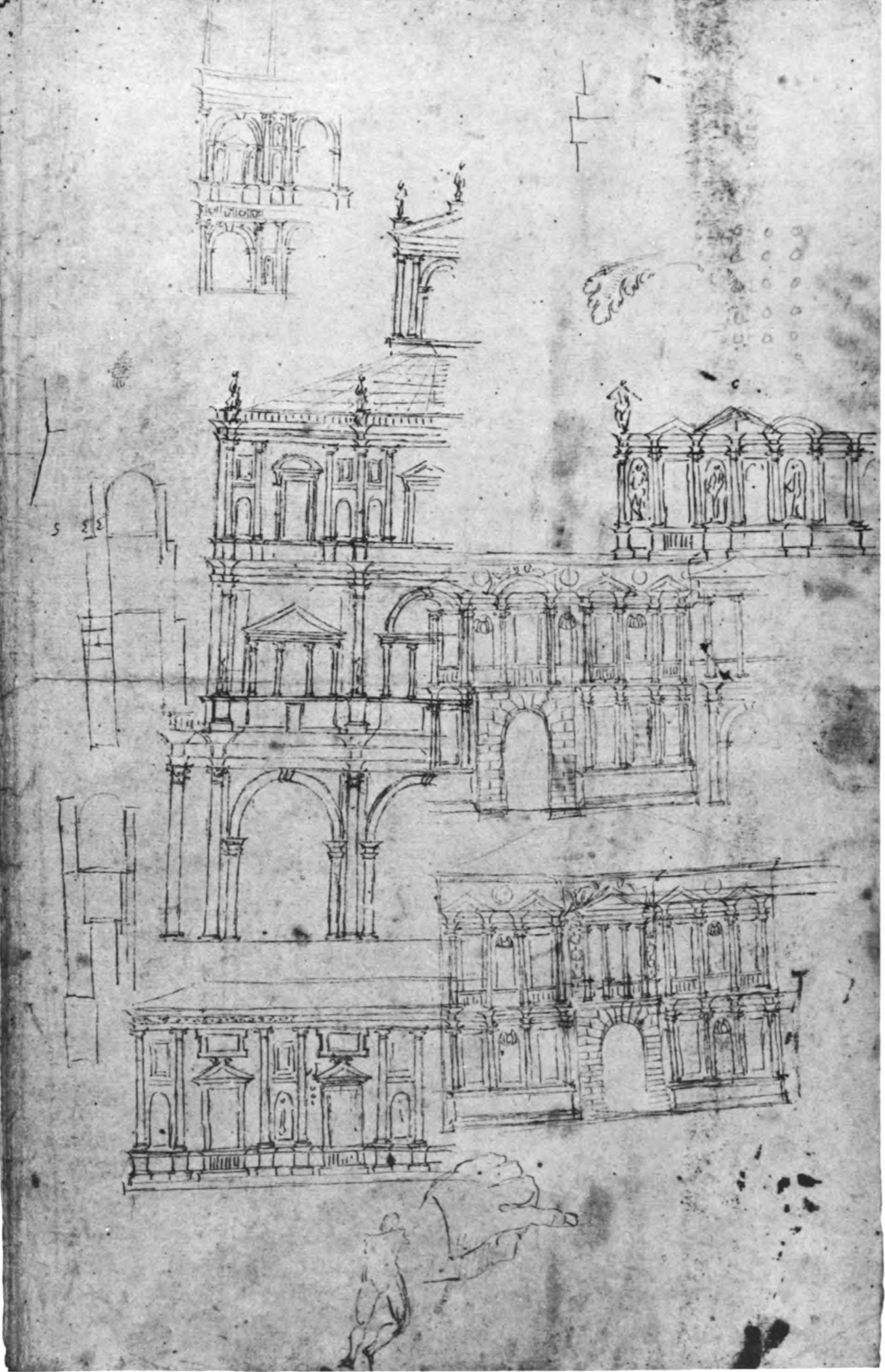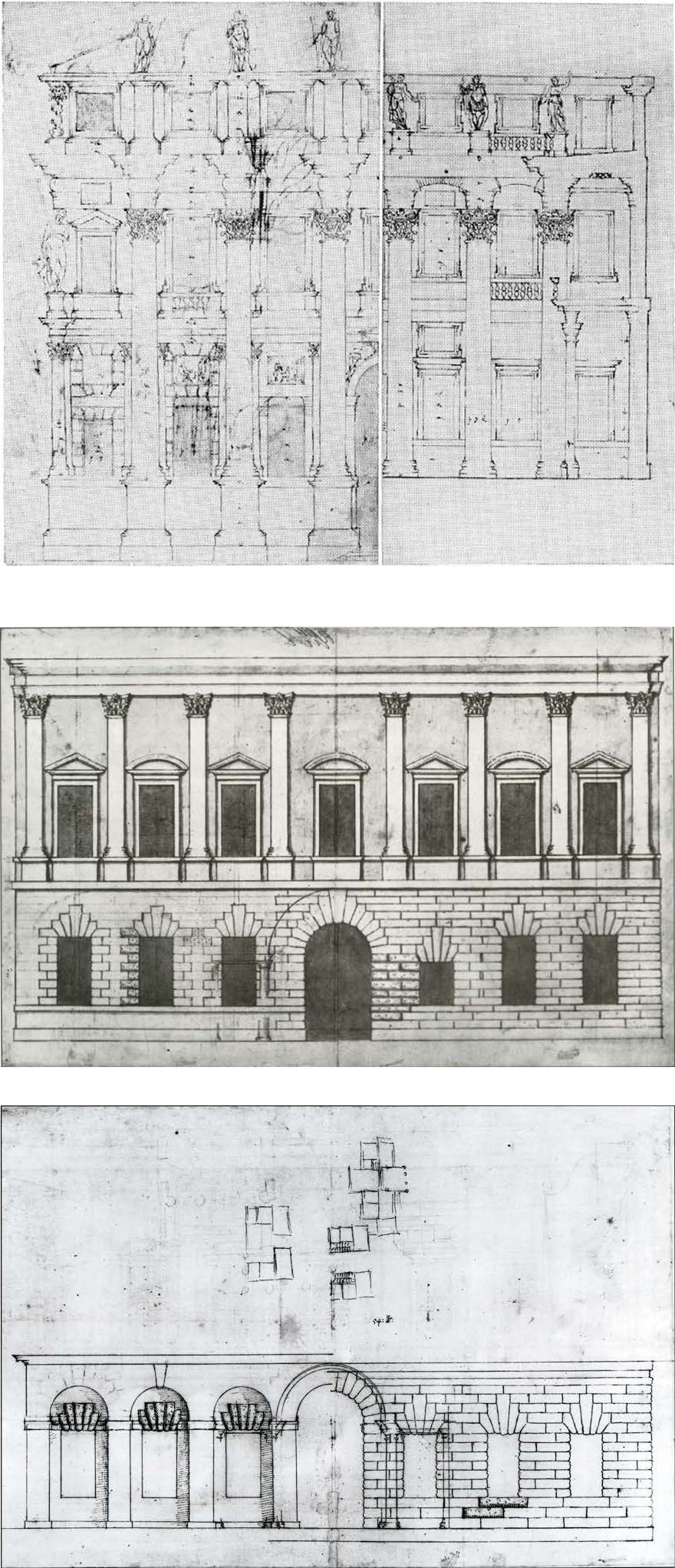 And I would propose that solutions like those of the façade of San Giorgio and of Palazzo Valmarana have been suggested to the author by his own drawings from antiquity or from his own inventions. But these must now be interpreted not as representations (which in fact they are) of a deep spatial composition with columns in the round, but as a kind of low relief in which the columns become pilasters, or are “crushed” against the wall, as in the facades of the churches.48