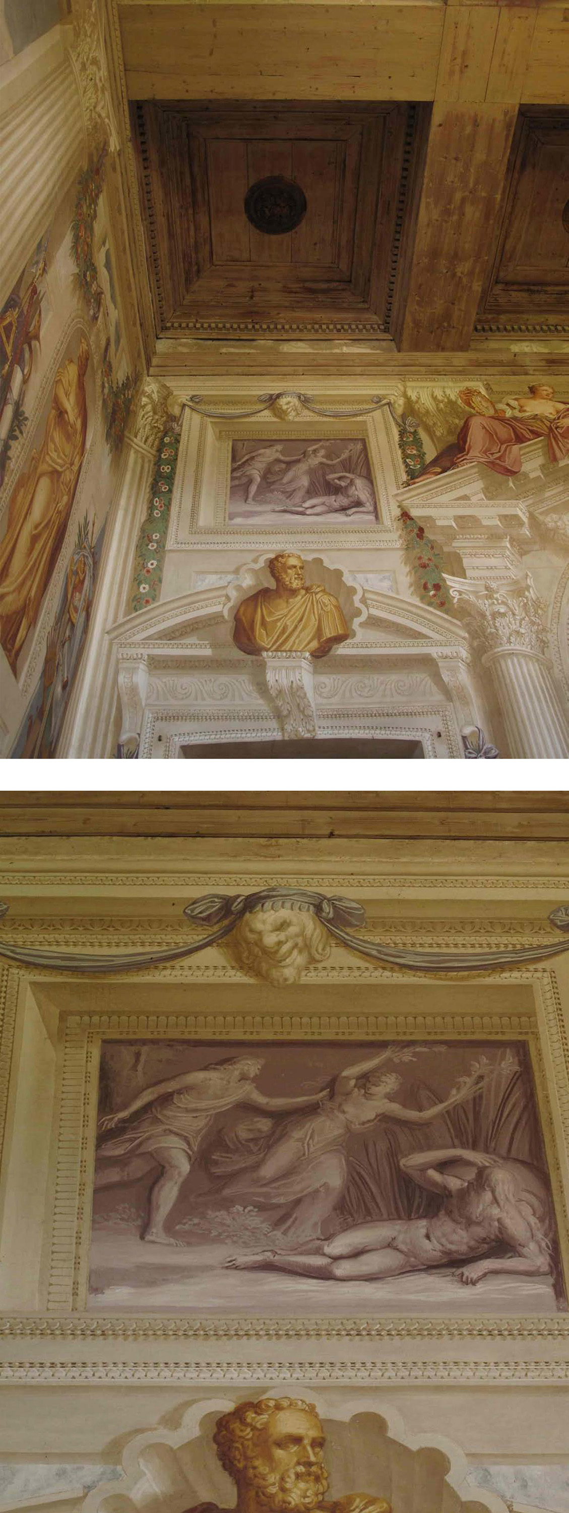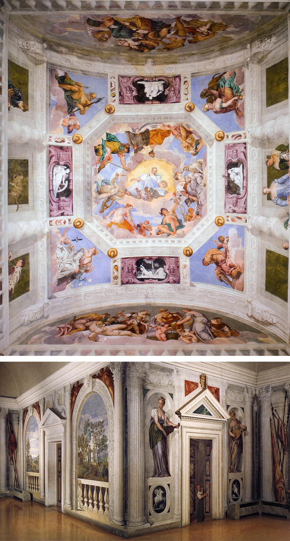 Thus, Gioseffi’s initial inside-out dis-placements and re-positionings provides a perspective to perceive these further displacements, replacements, and repositionings. Sliding not just backward and forward, as he suggested, but also laterally and transversely along the surface of the façade, actively instigating such operations through these representational techniques of media. Representations not just leading to, but manifesting as constructed reality. Not things represented as they “should be” constructed in reality, “complete and robust” as Palladio states toward the end of his “On Abuses,”46 but rather things constructed as they are represented—like the trompe l’oeil frescoes that suffuse the interiors of so many of Palladio’s buildings, which I will discuss in the concluding section. What is revealed in this equivocal ambiguity of things that are constructed “to appear to produce the effect … to make the structure … look secure and stable” are certain epistemological insecurities and instabilities inherent in the mediated production of appearances, impressed as they are through the Artificer’s signifying act, in the transition Barbaro proposed from inside the mind to outside sign.