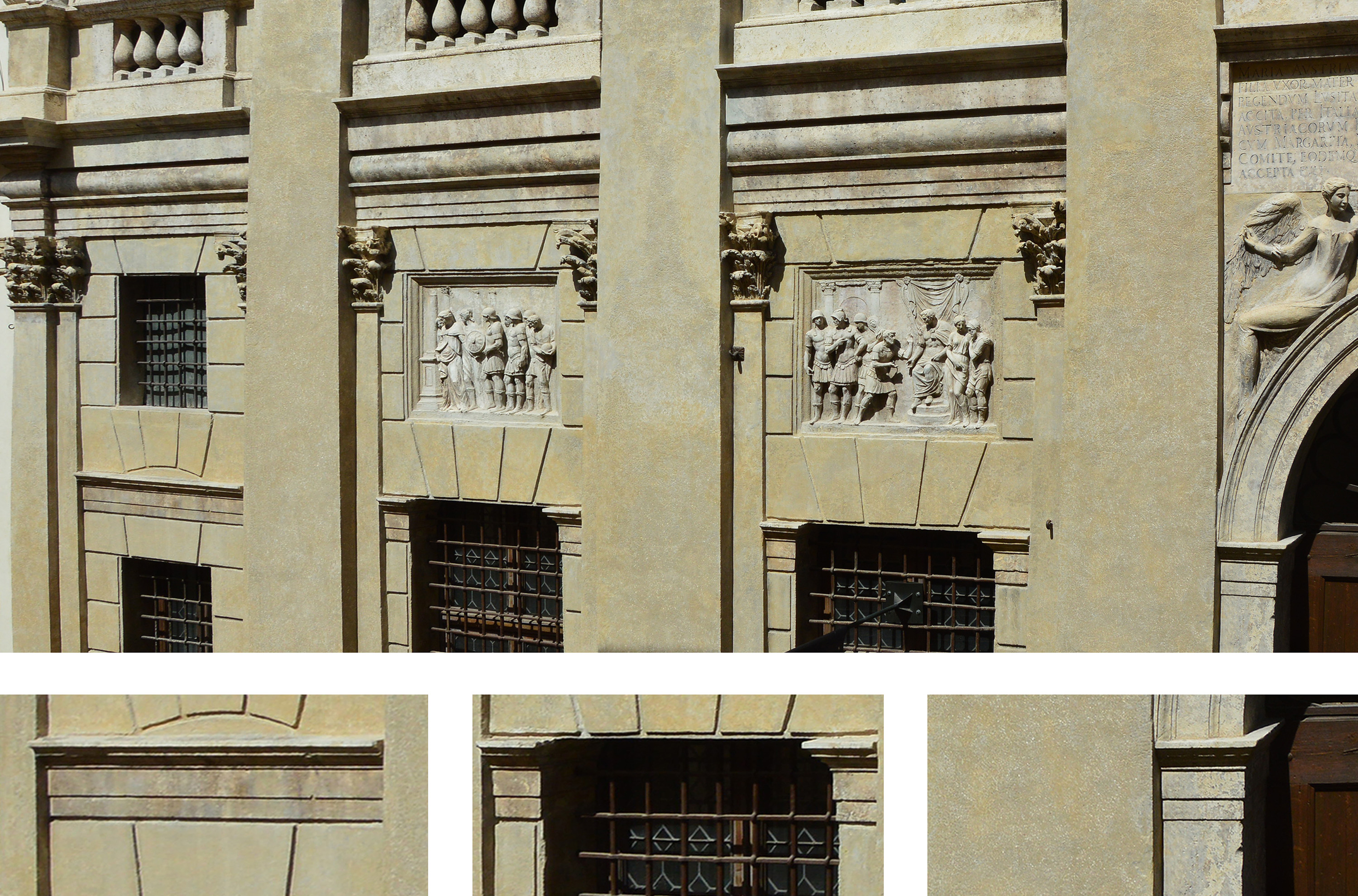 Wittkower, Architectural Principles in the Age of Humanism (1971), 83, 83n2, citing Ernst Gombrich, “Zum Werke Giulio Romanos: II. Versuch einer Deutung,” Jahrbuch der kunsthistorischen Sammlungen in Wien 9 (1935): 138n70. Gombrich’s description of these motifs consists of a single sentence, citing the “near borrowing” of the entrance tetrastyle atrium from Palazzo Te and the “exact copy” of the upper-floor windows from Giulio’s own house in Rome (as documented in the Uffizi drawing of the house): “Des ersteren Palazzo Tiene in Vicenza (datiert 1556) bietet in der Eingangshalle fast eine Entlehnung der Einfahrt des Palazzo del Te, in den Fenstern des Obergeschosses exakte Kopien nach dem Vorbilde der Uffifienzeichnungen.” As for the latter motif, all the particular tectonic figures (in their unique conjoined configuration) are shared between the window of Giulio’s House and those of Palazzo Thiene, even if the most evident albeit minor differences that makes this “copying” not quite exact are the additional rectangular blocks that band the Ionic columns (four in the former, five in the latter) along with the reduced number of voussoirs under the pediments (seven in the former, five in the latter).