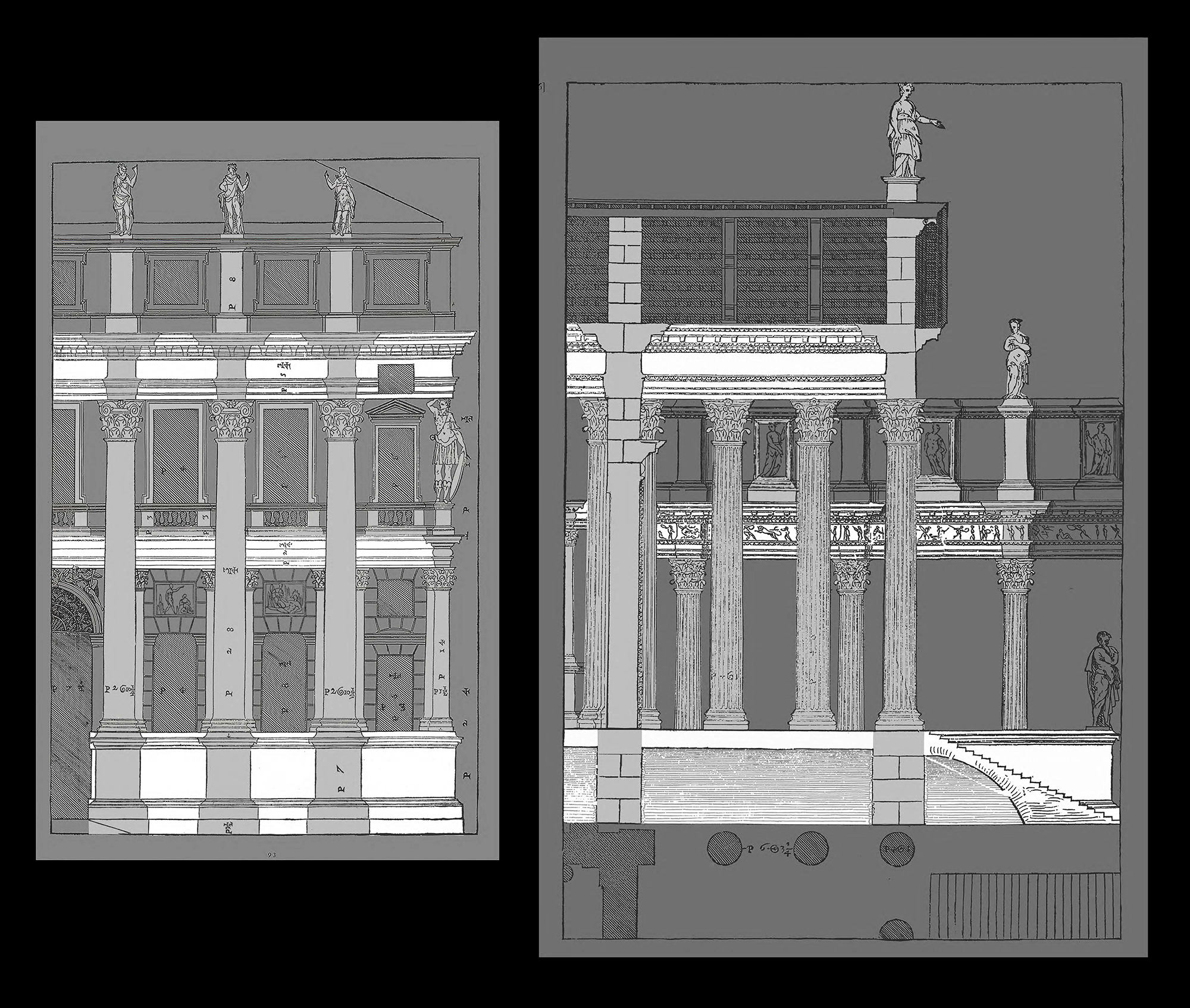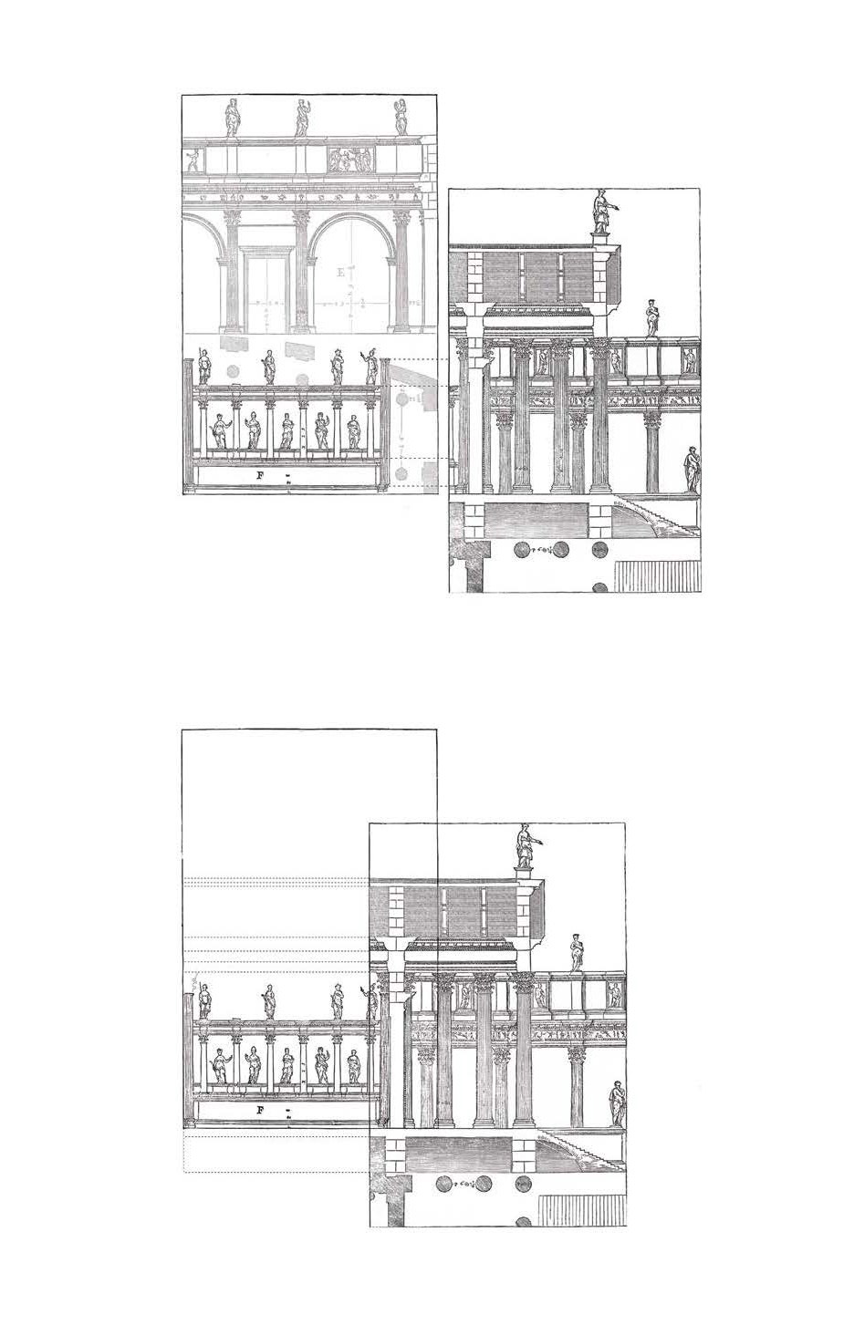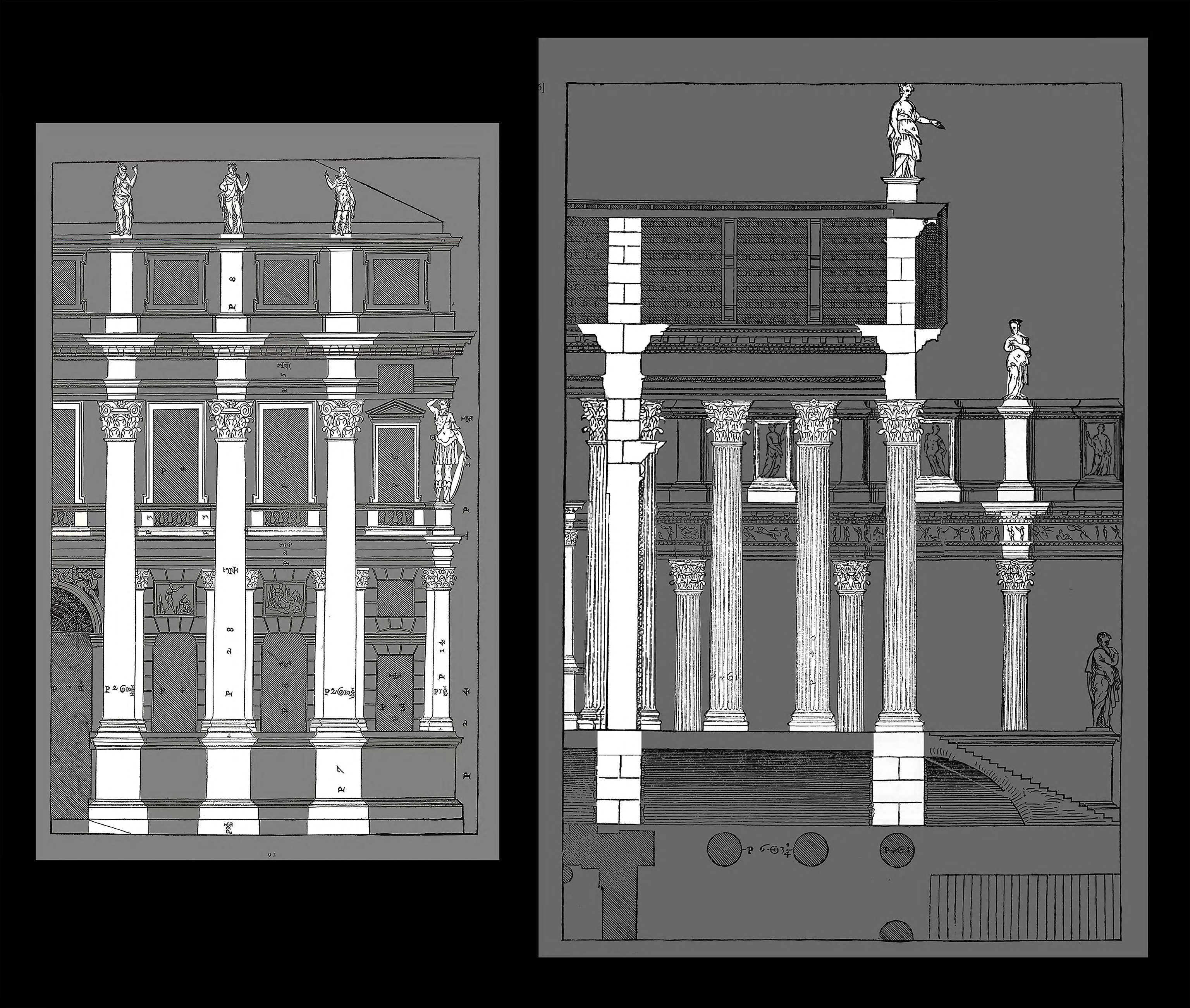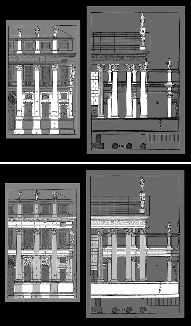 As Burns proposed, it is not necessary to adjudicate whether the positioning of the giant order at Palazzo Valmarana should be perceived as a foreground layer of columns repositioned outside-in toward a background layer, as he posited, or a background layer of columns repositioned inside-out to a foreground, as Gioseffi posited. And further, it should be noted that in addition to Palladio’s drawing and printing, the spatial possibilities enacted in an active way through the conjoining and interlocking of foregrounds and backgrounds is at work in a number of other media in relation to which Palladio was directly engaged, as will be discussed in the concluding section. For now, with regard to the media of drawing and printing, the hypotheses of Gioseffi and Burns should be understood as co-operative, co-citational, and co-incidental in terms of their design modes of apprehension and development.