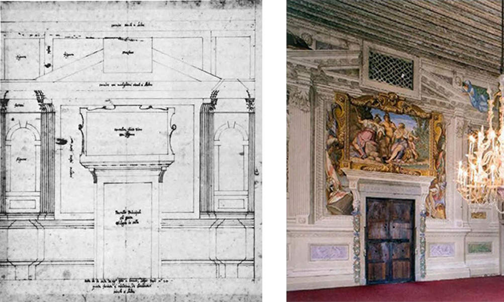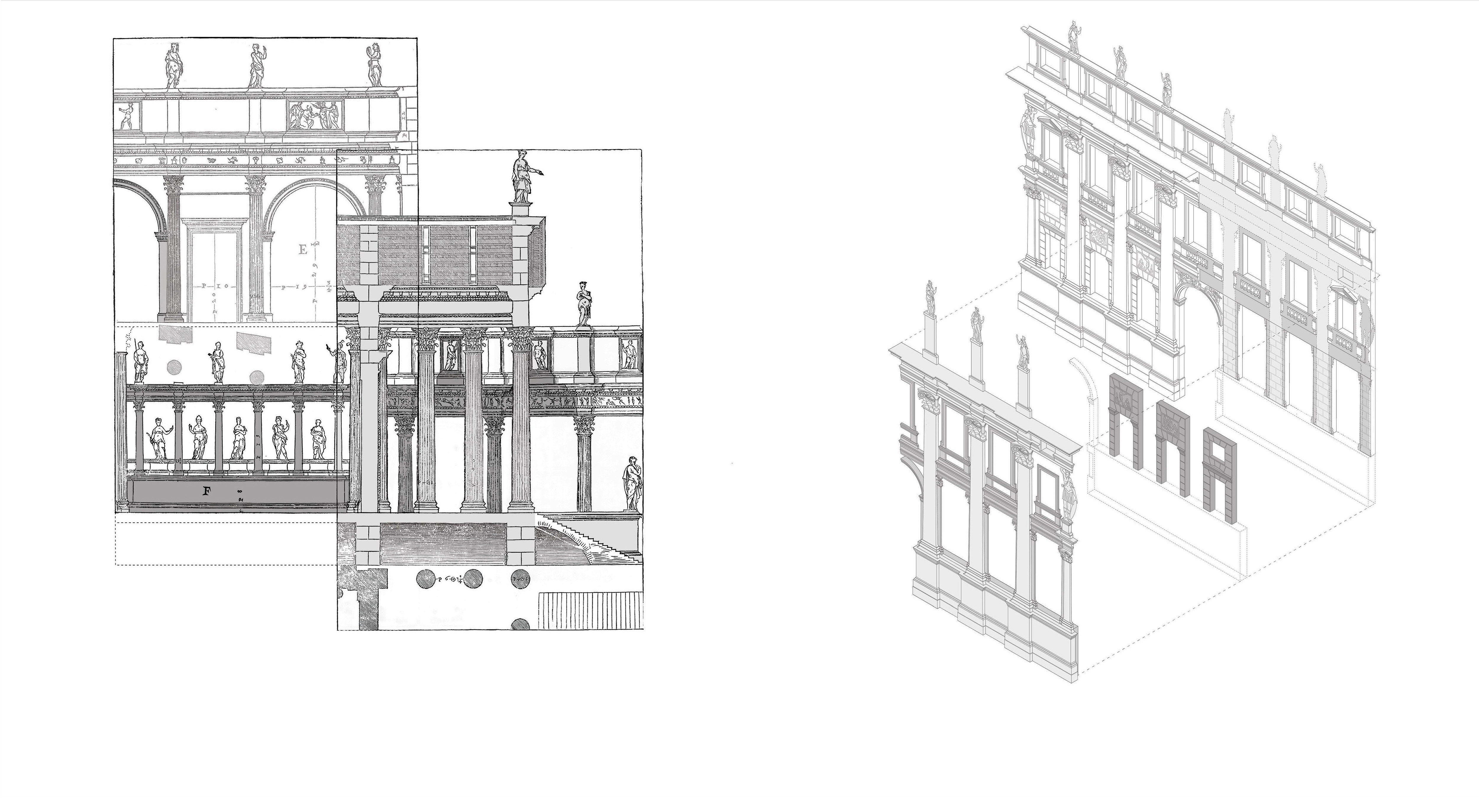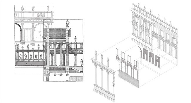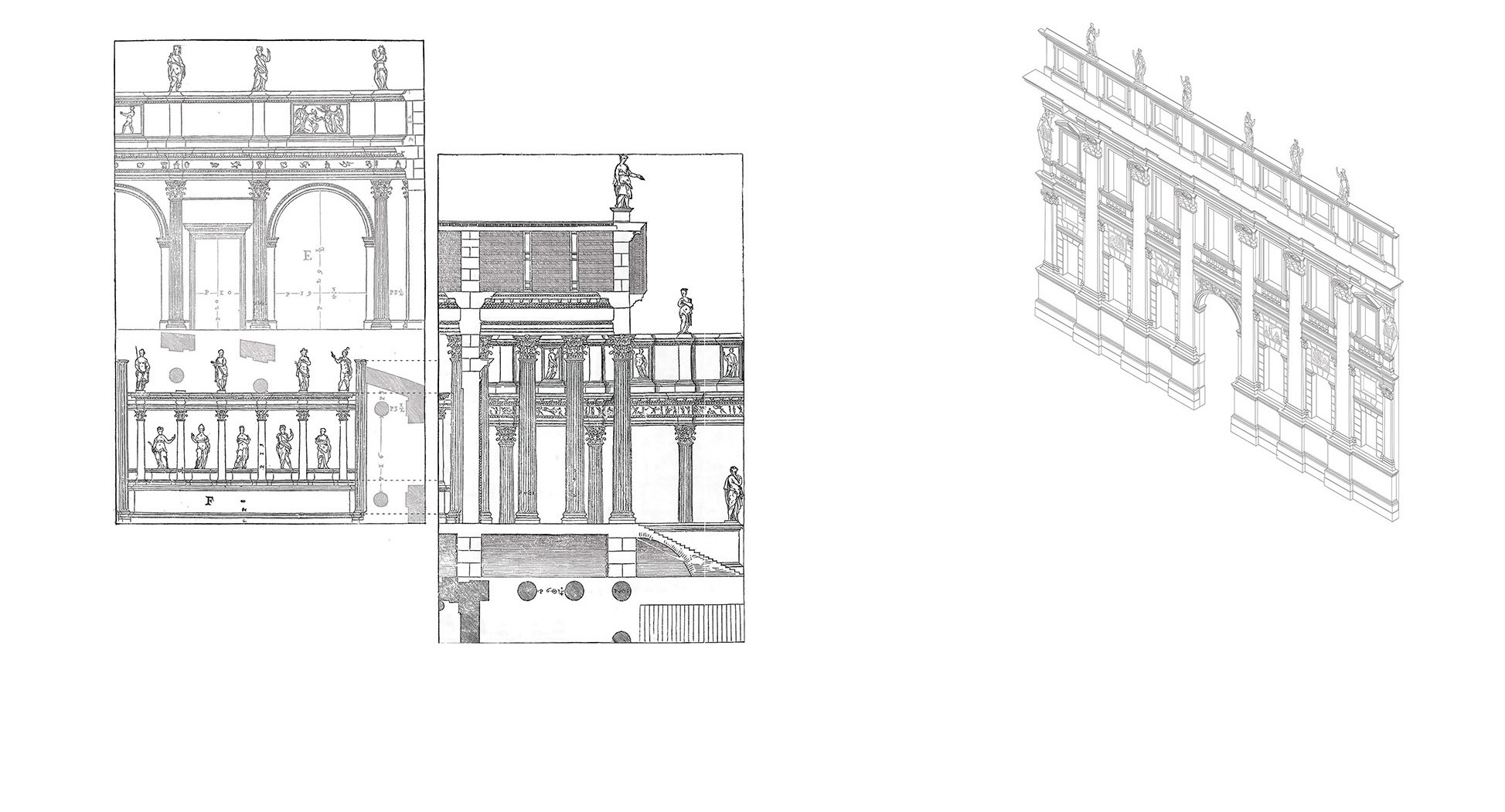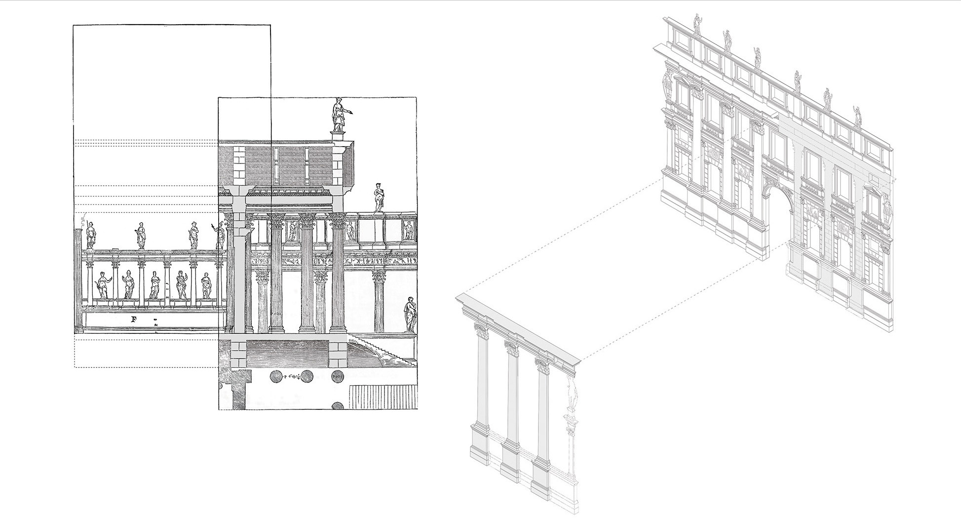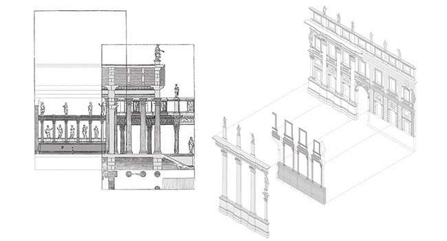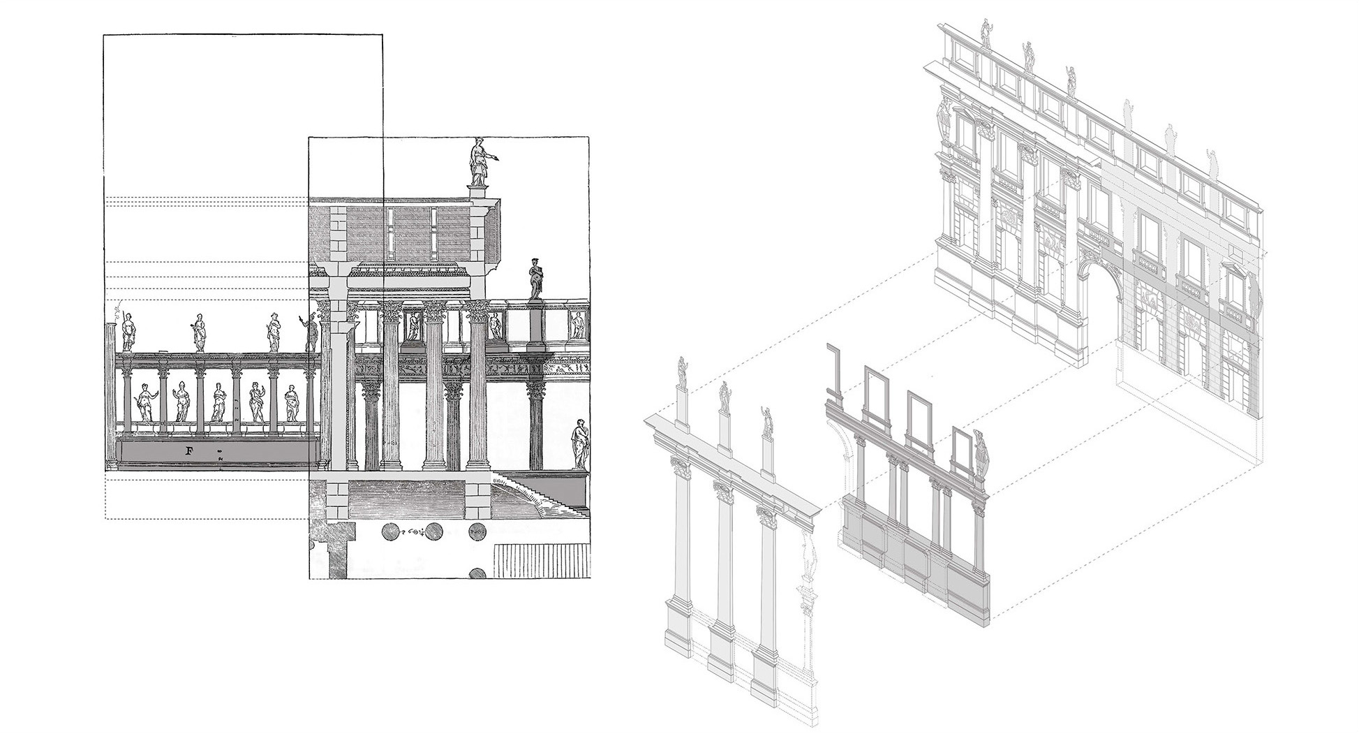 As Burns proposed, it is not necessary to adjudicate whether the positioning of the giant order at Palazzo Valmarana should be perceived as a foreground layer of columns repositioned outside-in toward a background layer, as he posited, or a background layer of columns repositioned inside-out to a foreground, as Gioseffi posited. And further, it should be noted that in addition to Palladio’s drawing and printing, the spatial possibilities enacted in an active way through the conjoining and interlocking of foregrounds and backgrounds is at work in a number of other media in relation to which Palladio was directly engaged, as will be discussed in the concluding section. For now, with regard to the media of drawing and printing, the hypotheses of Gioseffi and Burns should be understood as co-operative, co-citational, and co-incidental in terms of their design modes of apprehension and development.
