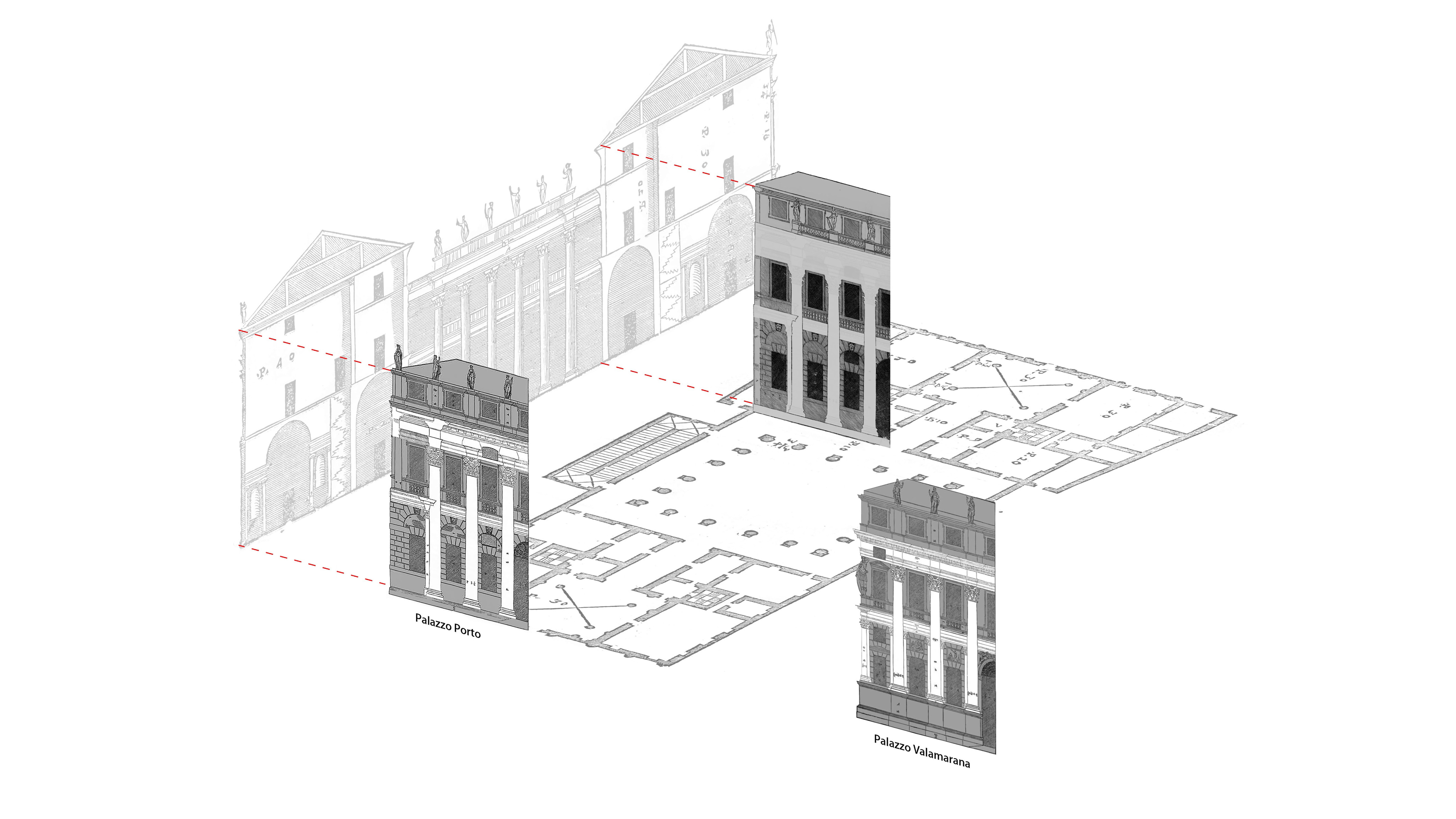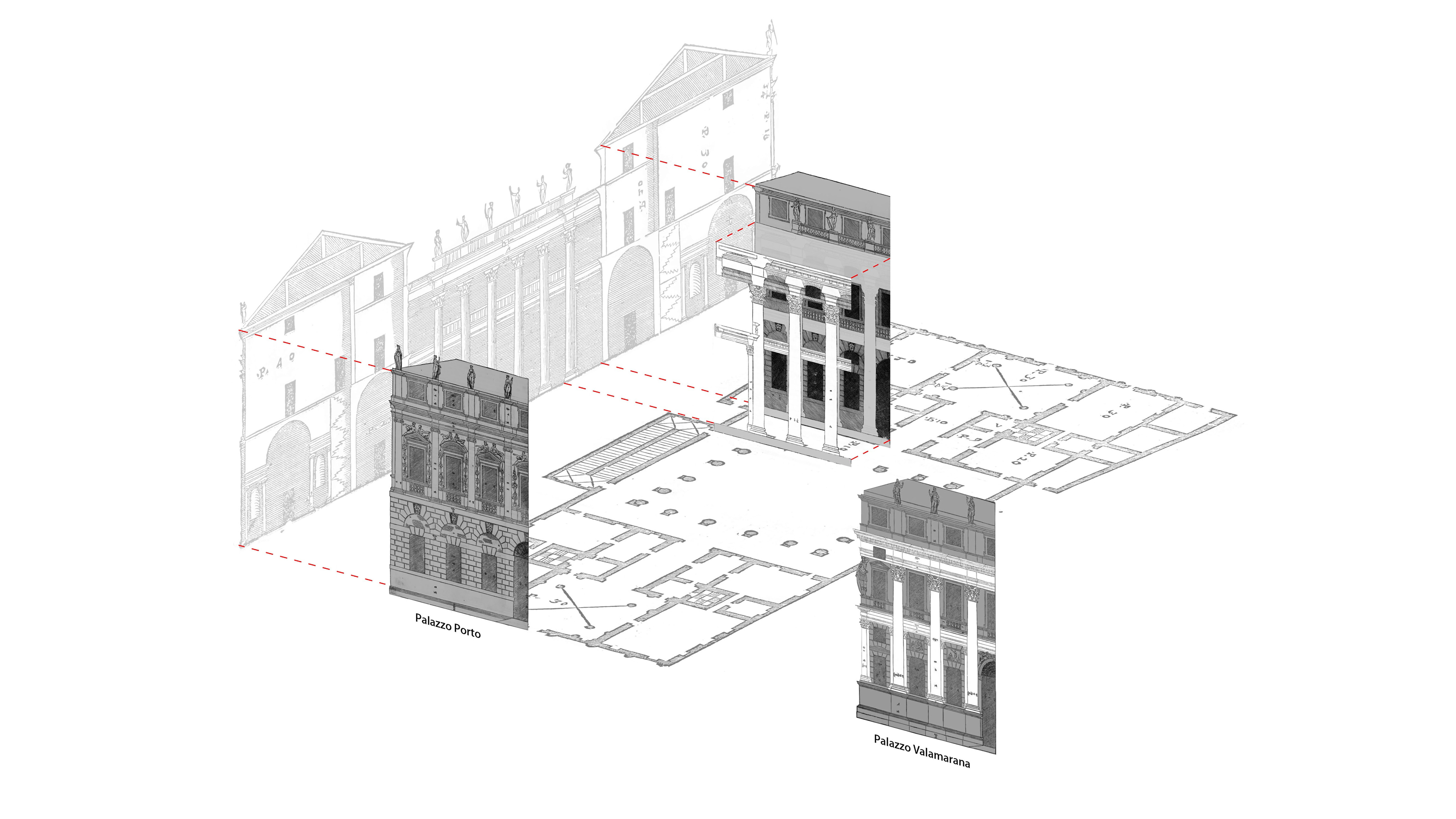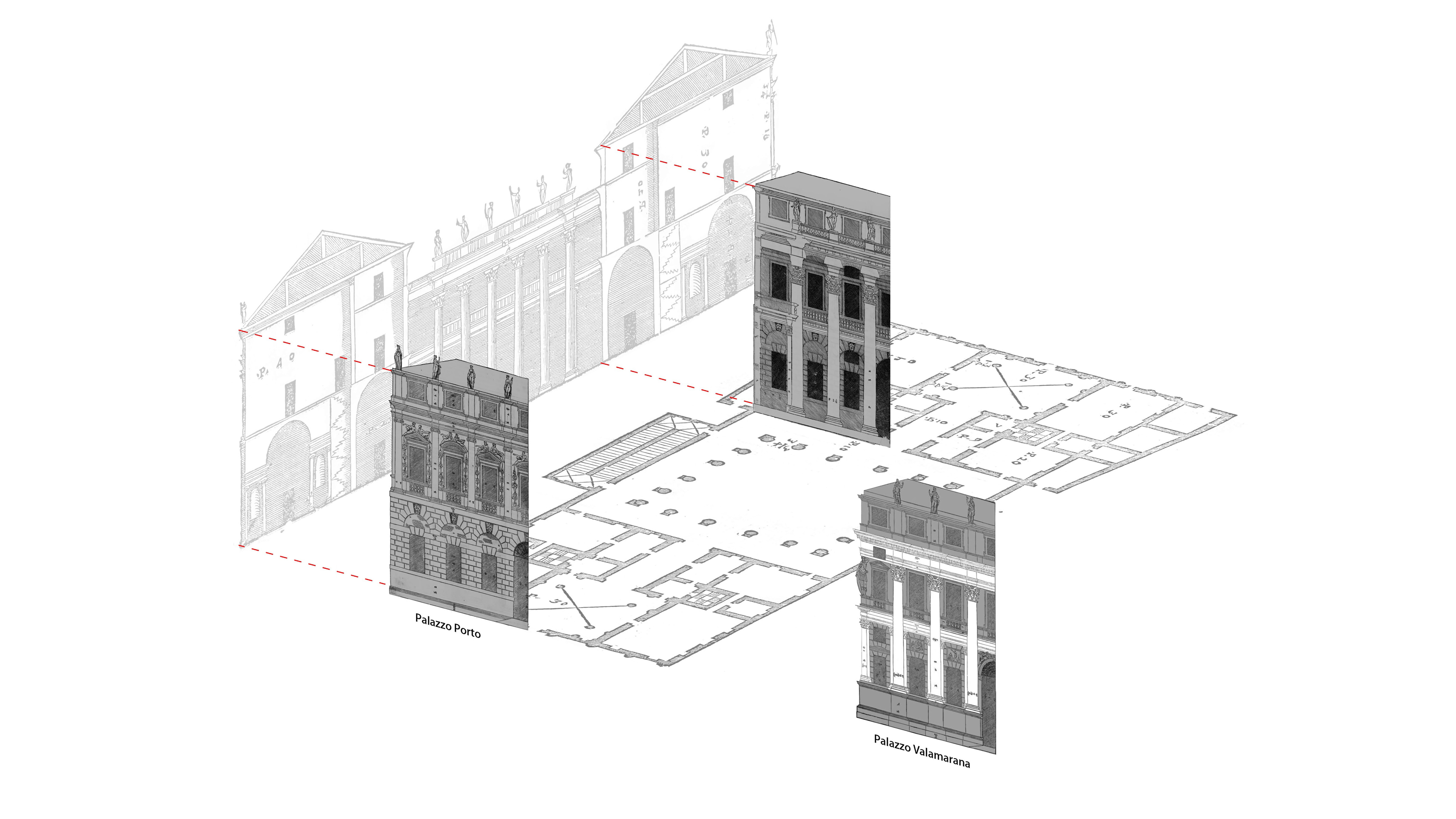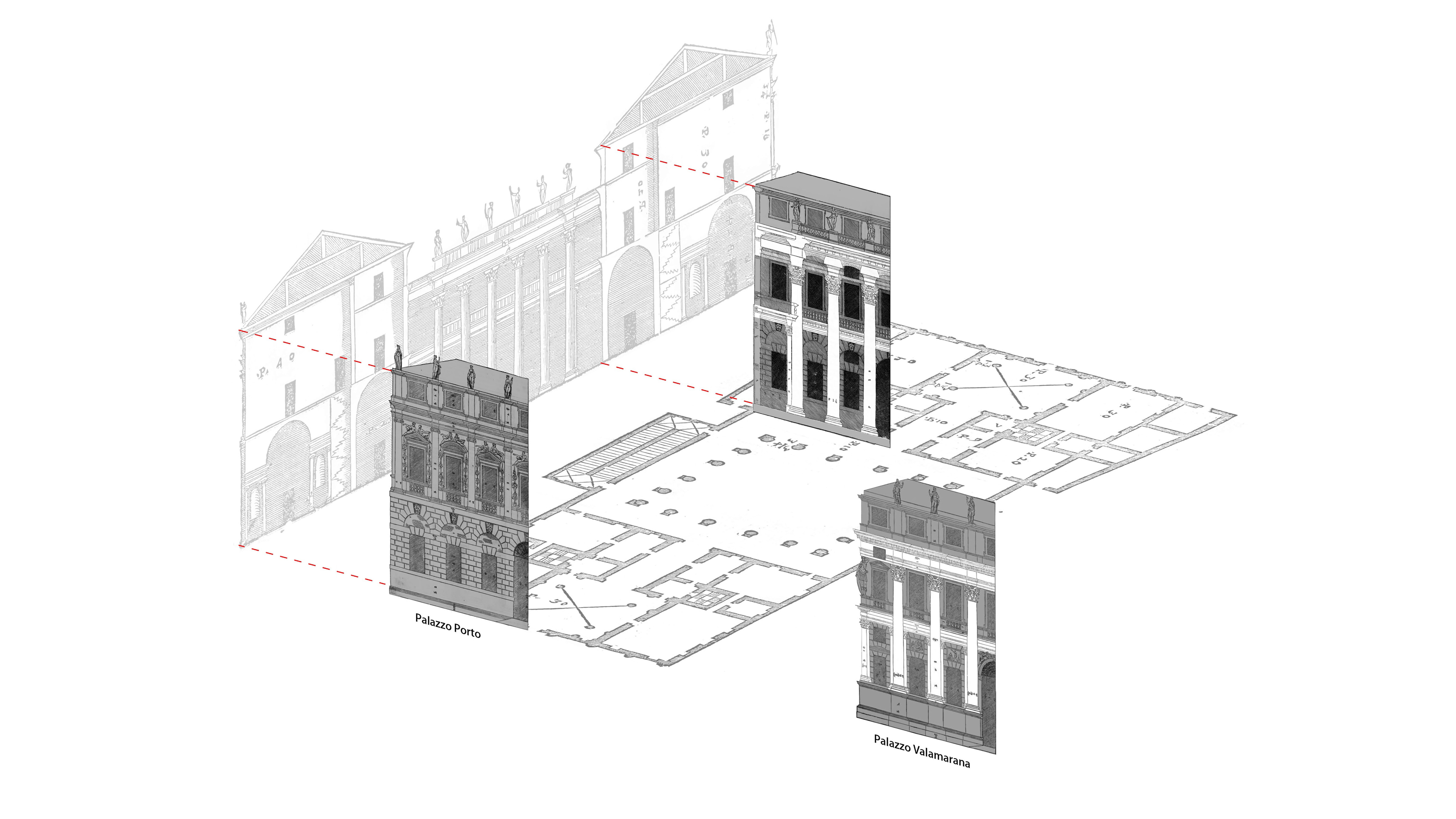 Fig. 12. (a) Andrea Palladio, Palazzo Porto to Palazzo Valmarana, shifting along “the axis of projection.” Digital visualization by the author.