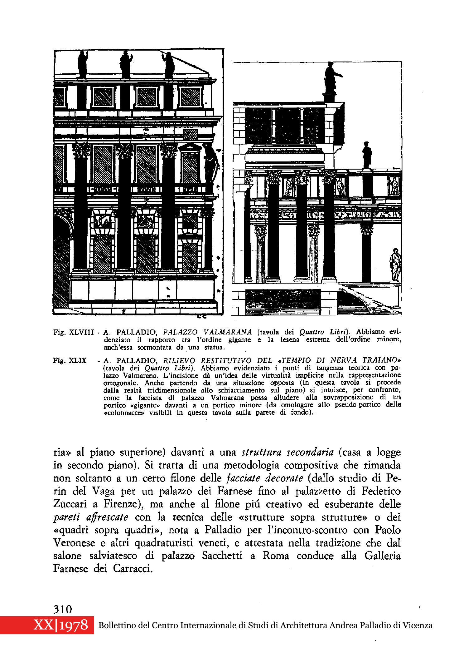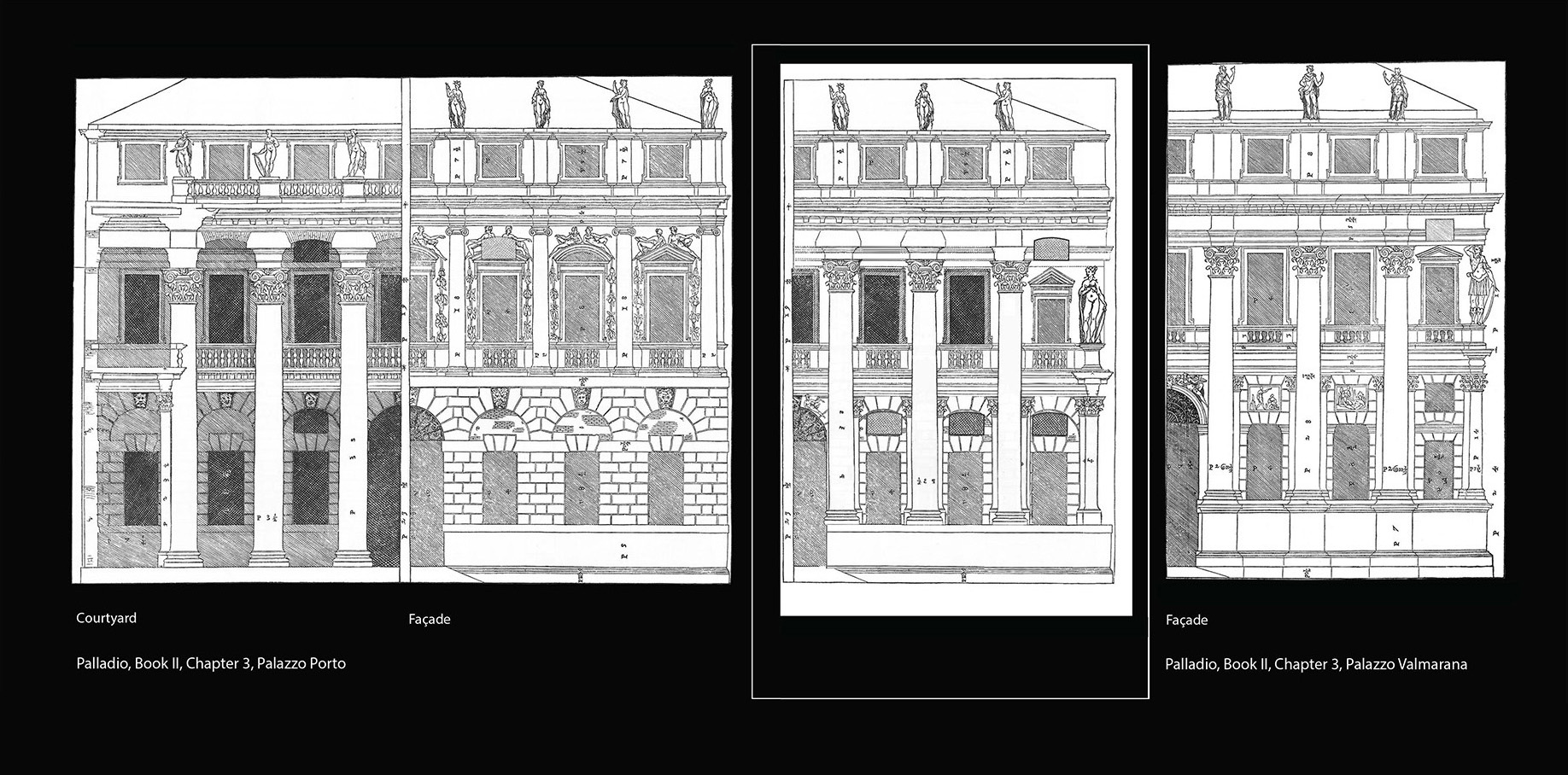 While Gioseffi described for the conception of Palazzo Valmarana a mode of inside-out, literally and figuratively, Howard Burns in “I designi”—published first, as mentioned, the following year in the 1973 exhibition catalog Mostra del Palladio and expanded later that year in the Bollettino del CISA—proposed a mode that could be called (although he also does not) outside-in.47 This may be considered literally as an outside portico or colonnade pressed onto the façade in the form of pilasters or attached columns, and figuratively as outside of Palladio’s own designs through his research into the works of antiquity: