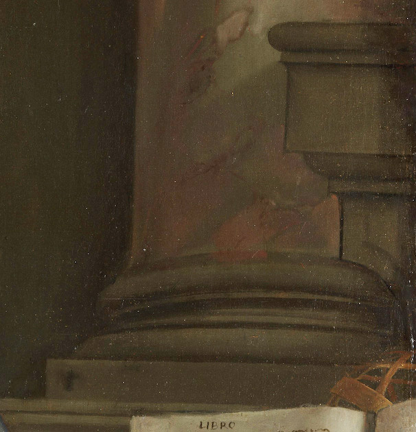 In Veronese’s well-known portrait of this patron in the Rijksmuseum, Daniele Barbaro is shown demonstrating the discursive quality of his reasoning by displaying pages depicting distinctive delineations he had in his mind of emblematic signs of architectural and astronomical figurations, imprinted as in his 1556 Vitruvius, along with a backdrop of their “actualized” related counterparts—interactively multilayered, as will be addressed in later sections, through the recursive foreground, middle ground, and background of the painting (Fig. 4a). Unlike the more generalized earlier portraits of Barbaro, the Rijksmuseum portrait has been aptly utilized by numerous commentators as the one that most signifies the official cultural and social portrayal of Barbaro’s character. Starting in the middle ground with his status in the ruling elite of Venice, Deborah Howard observes that his “ecclesiastic’s cape or mozzetta and finely pleated white muslin surplice,” a form of dress, is “readily associated with patriarchs.”11 This status is directly connected in the portrait’s fore- and midground to Barbaro’s extensive engagement with scholarly writing.12 The painting depicts his edition of Vitruvius as the media work he is most identified with and the work, as portrayed in this portrait, which most enacts and identifies him in the midst of imprinting his signifying practice through media. As Xavier F. Salomon has recognized, Barbaro’s grip on the book directs us not to its title, nor surprisingly to the very authorial name of the person being portrayed, let alone to the author being translated—all of which would have appeared toward the top of that page had Veronese not compositionally and tellingly defined this portrait’s edge by their extended absence—but rather to the bottom line of text (Fig. 4b), which even with its painterly drafted inscription signifies the publisher’s imprint (to use a third sense of this term).13