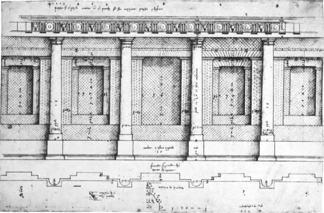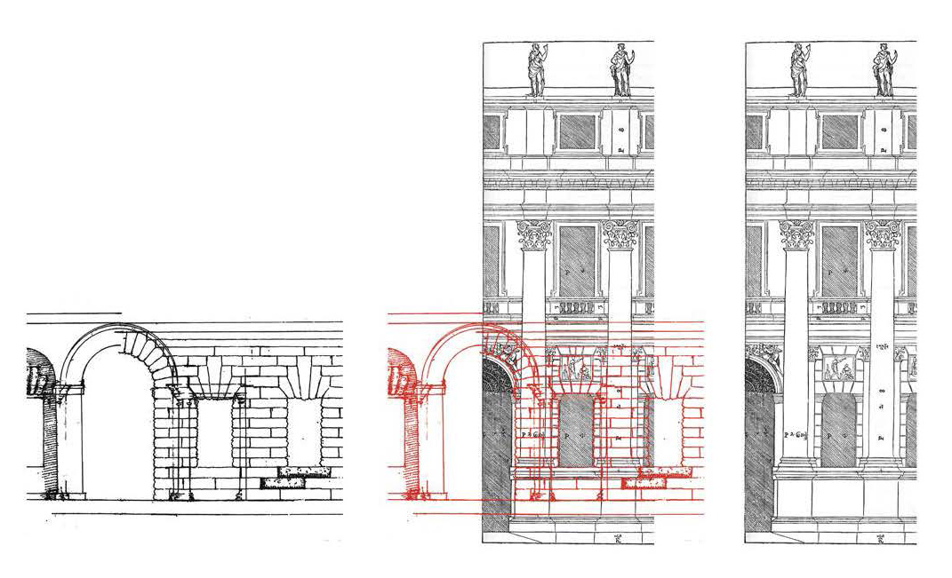 (3) The giant Composite order can now be elevated along with the secondary Corinthian loggia support from the courtyard (Fig. 14c).