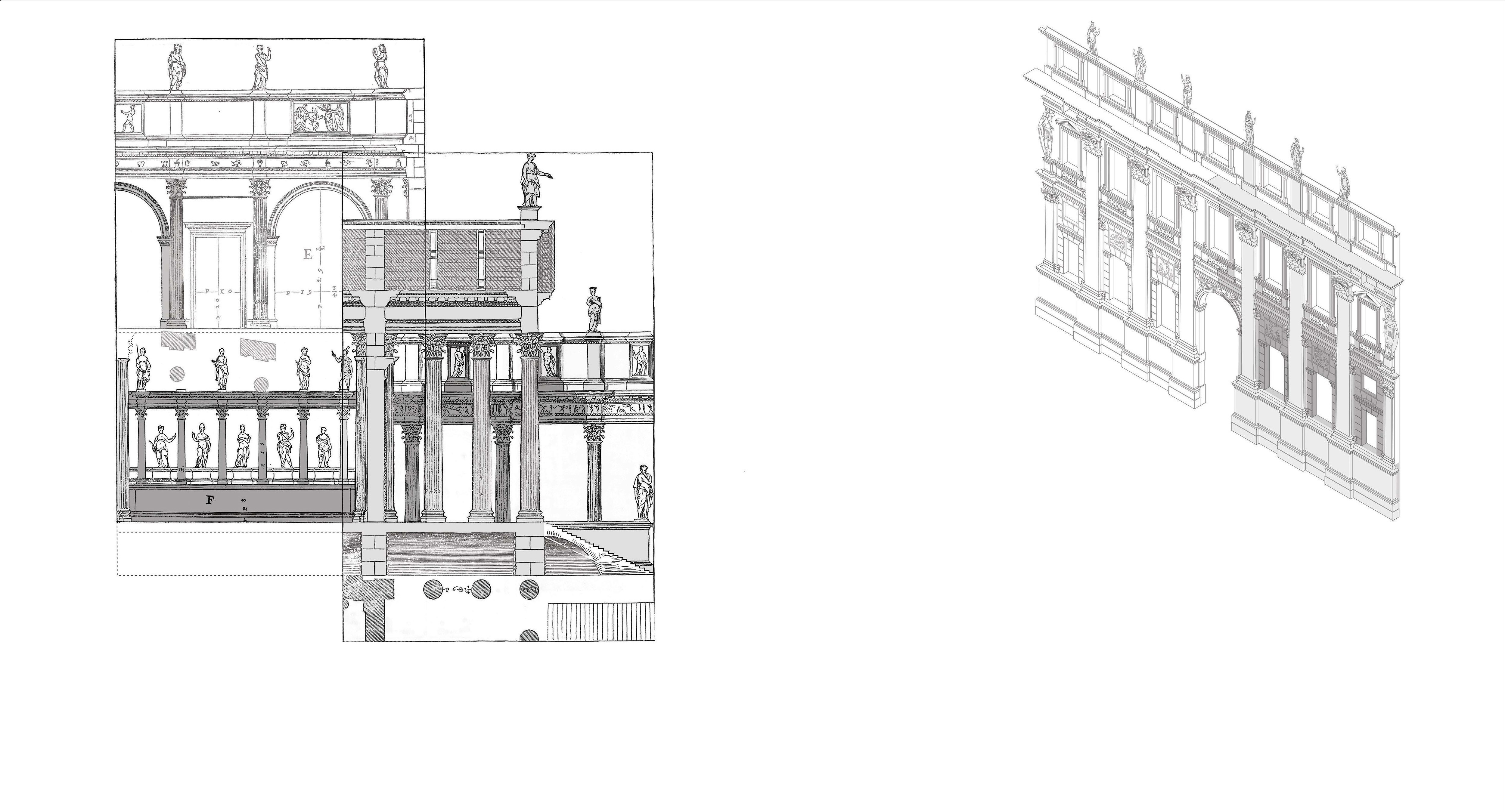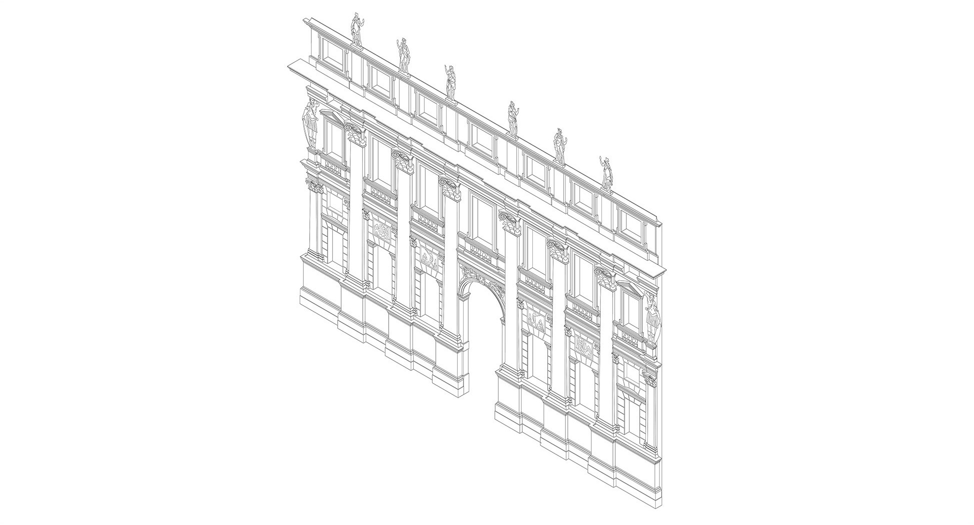 (4) This secondary order is redistributed laterally to the ground-level apertures as flanking pairs and as one full pilaster to complete the missing corner position, which provides the appearance of supporting the end statue (Fig. 14d).