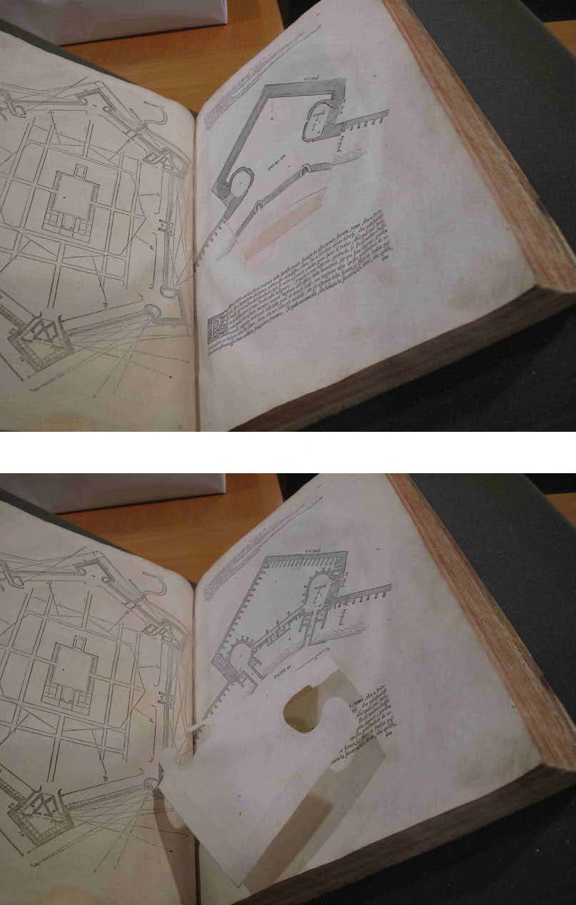 And yet, the dimensional flattening of orthogonal drawing that aimed to demonstrate things as they are lacked the ability to demonstrate things as they are perceived (and thus conceived) spatially and temporally, and thus it is not surprising that innovative forms of representation were utilized in Barbaro’s 1556 edition of Vitruvius, which attempted to enact the simultaneous layering of spaces and surfaces (outside-to-outside, outside-to-inside, and inside-to-inside) through various modes of visualization: the transparencies already mentioned, elevations and sections side by side as split-screen comparisons, cut-away three-dimensional views, even several illustrations that were reproduced as separate, smaller layers of paper that could be rotated or lifted up off of their pages, as in the exterior view of a bastion at the end of chapter VI of Book I that is layered in the form of a flap over its interior view (Fig. 17).