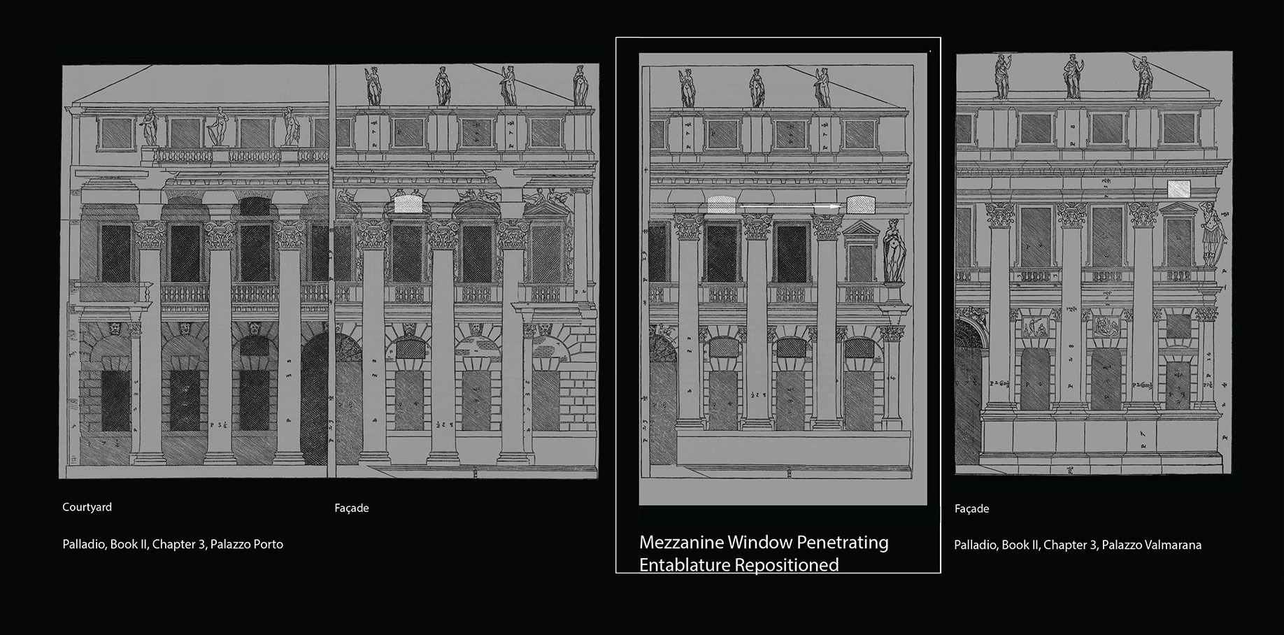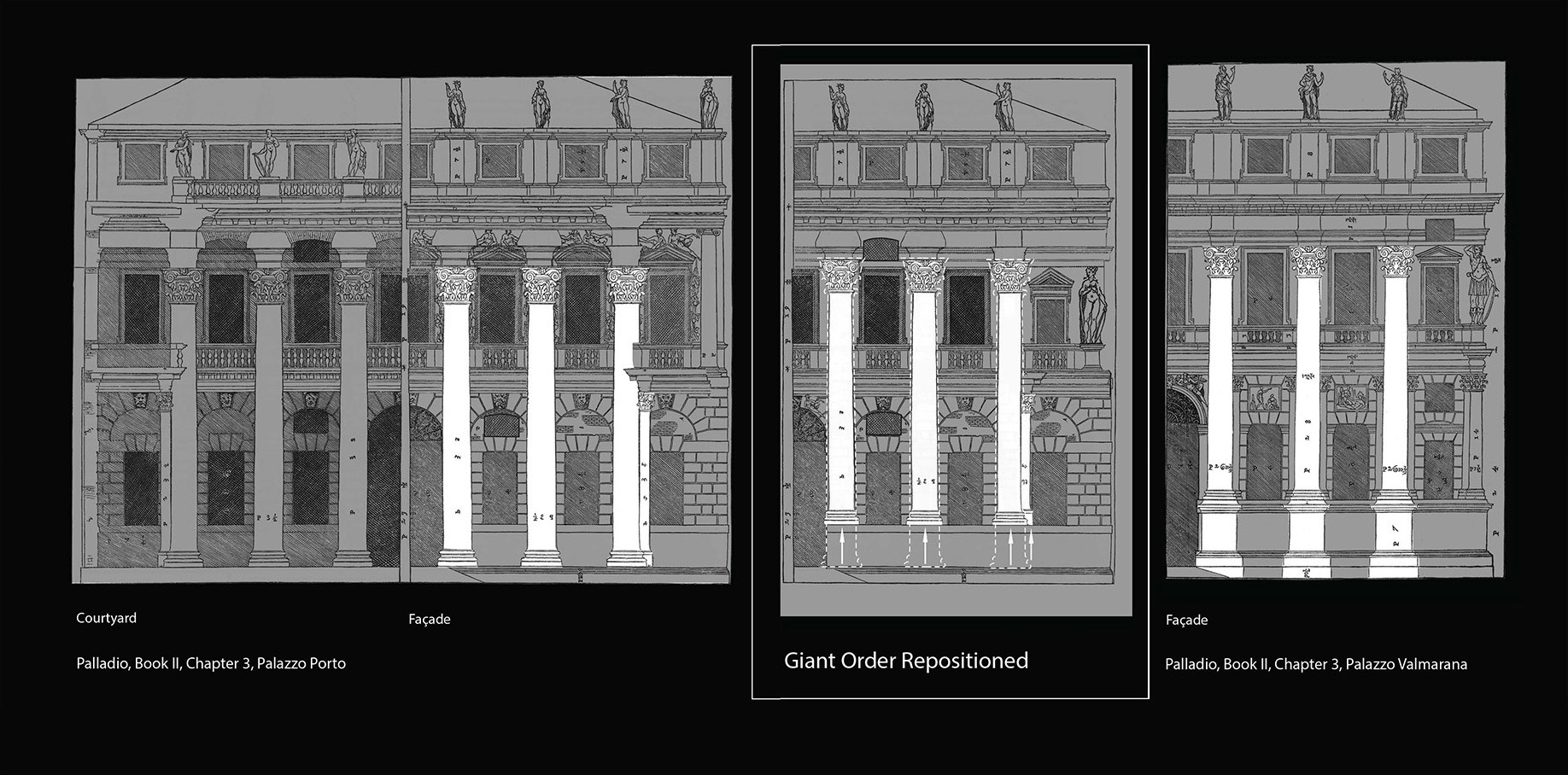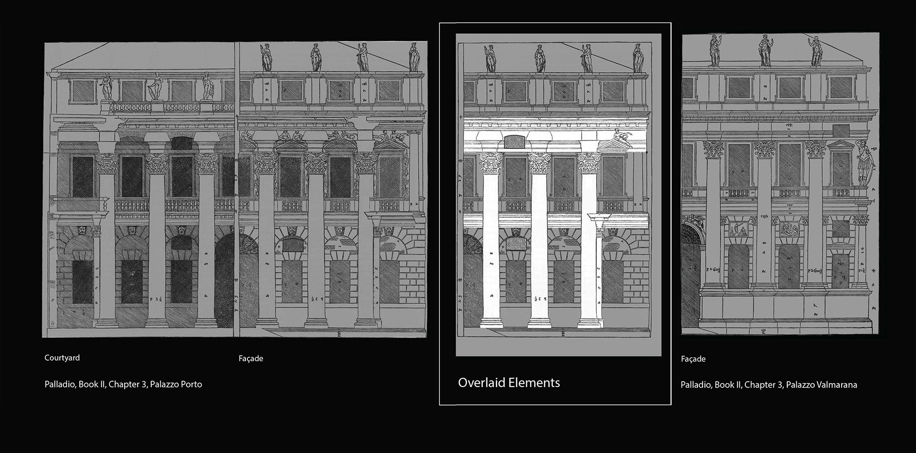 (b) Andrea Palladio, Palazzo Porto Courtyard Elevation and Façade Elevation Overlaid, the Orders’ “cry of pain.” Digital highlighting by the author.