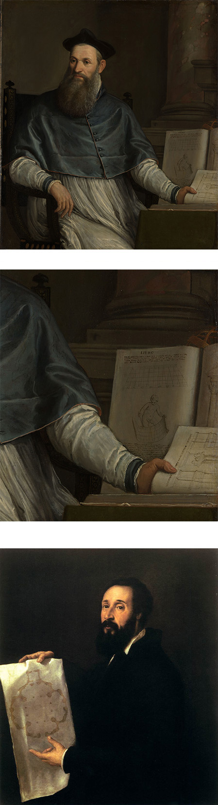 Duncan Bull has observed how Veronese’s positioning of Barbaro and his media coincided with that of another significant portrait by this fellow Venetian painter, as it makes “use of the device, employed by Titian in his portrait of Giulio Romano of ca. 1537 [Fig. 4c], of showing a sitter holding an item that indicates his intellectual achievements while turning away from it.”14 Barbaro’s turning thus turns us toward the book itself, whose portrait this painting is of, as much as it is of Barbaro—even honored and titled with the only legible word (LIBRO) in the otherwise pseudo script of the painting. In this regard these painted pages have come to signify how Barbaro’s two decades spent waiting to become Patriarch of Aquileia—perpetually the next in line from his election in 1550 to his death in 1570—allowed him the time to pursue such intellectual achievements. In contemporaneous written accounts this seemingly contemplative patrician is portrayed nonetheless as a defender of a civically active life, as Manfredo Tafuri has noted, with a “strong need for action guided by theory,” and thus like Vitruvius critiquing the spatial practices of his contemporary Roman times, Barbaro felt compelled in his Vitruvius to comment on contemporary Venetian spatial politics. These comments ranged in scale from his critique of the local domestic building traditions of his fellow patricians, to his advocacy to modernize the construction of the civic institution of the Arsenale, to more extensive territorial recommendations regarding the reform of the fortifications of the city and the ecological management of the Venetian lagoon.15