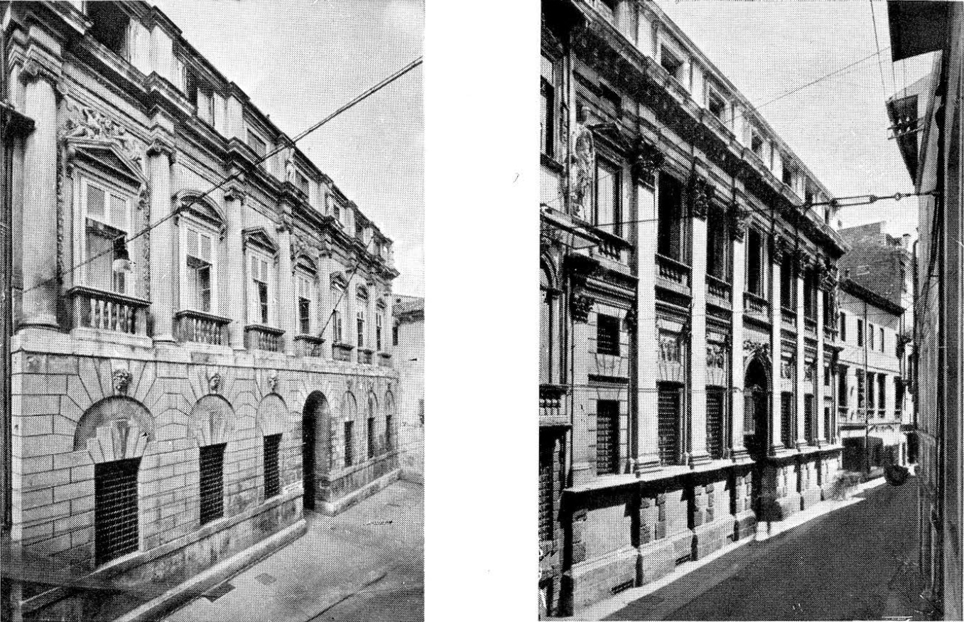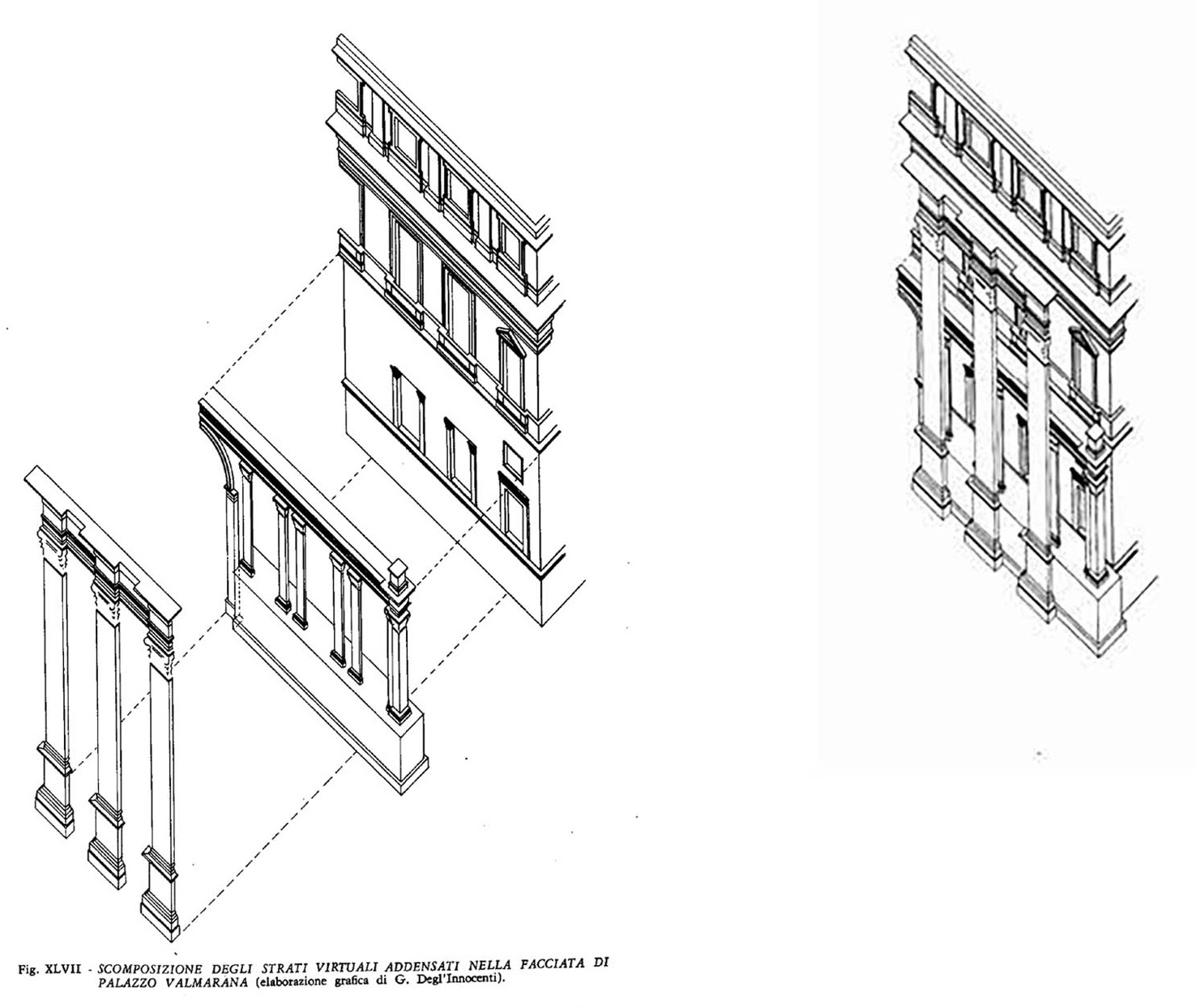 the wonderful creations of Palladio of the last fifteen years (and not only of those) often have their effectiveness in a daring and very original (and at the same time practical and economic) tradition of schemes with round columns into schemes that adopt pilasters and half-columns. Thus the facade of a temple, thanks to the mediation of a drawing, can become the facade of S. Giorgio Maggiore. And the design for the courtyard of Palazzo Da Porto Festa can become—as Gioseffi brilliantly and graphically demonstrates—the façade of Palazzo Valmarana.56
