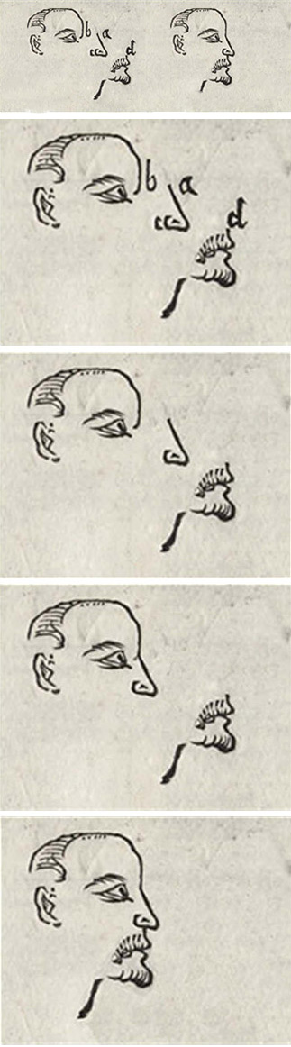 What Gioseffi did observe is the difference in the base datums of the two giant orders, and thus he understandably lifted up the columns that rest on the ground in the Palazzo Porto courtyard to match their elevated position on pedestals in the Palazzo Valmarana façade. But rather than reposition and rescale just the columns, he rescaled the entire Palazzo Porto plate, throwing off the co-incidence of the other comparable coordinates. In order to comprehend this comparable process of transformation from the earlier to the later palazzo as a series of coordinated design actions, it is most productive to proceed sequentially and consequentially in order to verify the hypothesis of the relation between these two palazzos in their positioning and repositioning. In other words, if we take Gioseffi’s suggestion of their mediated relation but proceed beyond his initial two steps (bringing the columns forward and then elevating them), by following through to further correspondences we can track a number of simple transformative steps that it would take to complete the substantive transformation that these modes of transfer made possible through these imprinted means (Figs. 14a–g). Using the I Quattro Libri woodcuts for more precise comparability, the following is one of several possible sequential and consequential serial transformations that may assist us in comprehending the designed relations between the two palazzos as initiated by Gioseffi, with no claim as to whether this sequence was the definitive order of steps Palladio undertook:
